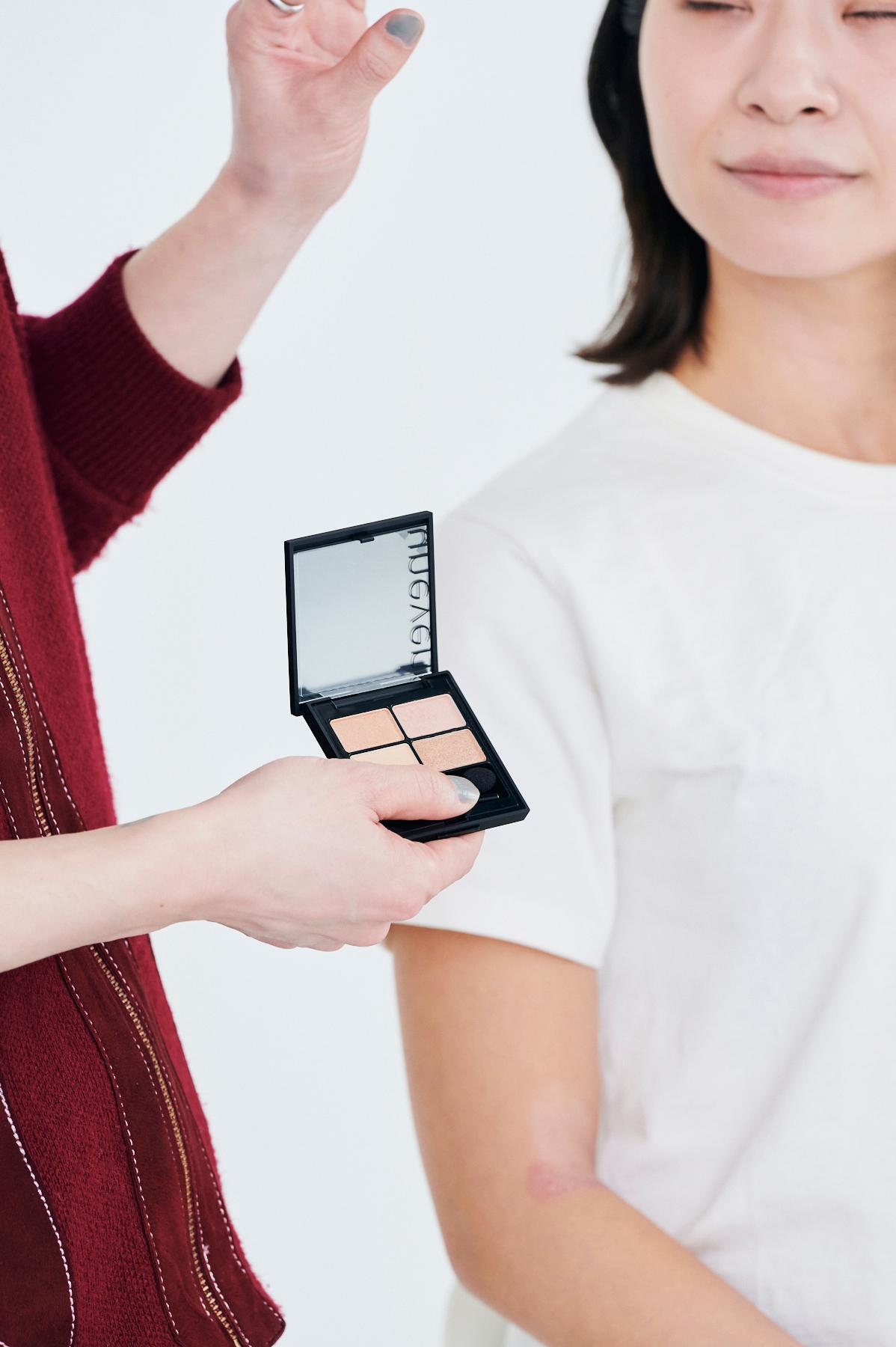 角さんの目元はピュアで優しい印象があるので、クールな黒ではなく、柔らかいチョコレートのようなブラウンを使いたいと思います。瞼を引き上げて、黒目の上から目尻に向かってまつ毛のキワを埋めるように左右に伸ばしていきます。ジェルなので軽い力でさっとなぞる程度で大丈夫。細めのさりげないラインが今っぽくておすすめです。