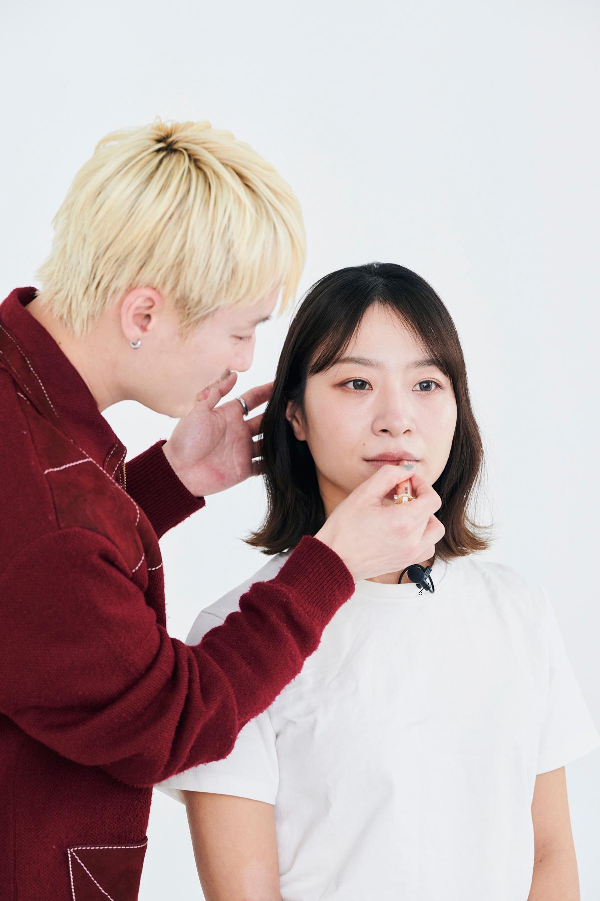 角さんのキュートなパーツやお肌のツヤ感といったチャームポイントを生かしてメイクしました。カラコンを普段から使っているということで、目元の印象は十分あるので、アイラインは質感も色味も柔らかく、優しい雰囲気を目指しました。