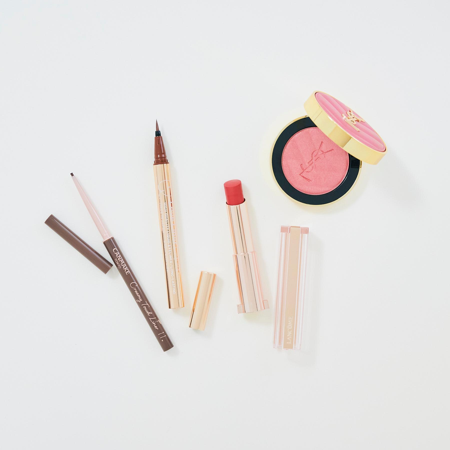 左から:キャンメイク クリーミータッチライナー 11 ¥715(井田ラボラトリーズ TEL. 0120-44-1184)、ラブ・ライナー リキッドアイライナーR4 ミルクブラウン ¥1,760(msh TEL. 0120-131-370)、イドル リップ バターグロウ 50 各¥5,500(ランコムお客さま相談室 TEL. 0120-483-666)、YSL メイクミーブラッシュ パウダー 44 ¥8,360(イヴ・サンローラン・ボーテ TEL. 0120-526-333)
