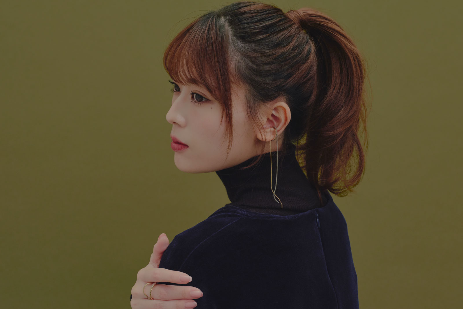 ワンピース¥26,400(マノン/エムケースクエア TEL. 06-6534-1177) タートルネックニット¥19,800(ハクジ/ショールームリンクス TEL. 03-3401-0842) イヤーカフ¥2,090 リング¥1,980(共にゴールディ TEL. 0120-390-705) その他はスタイリスト私物