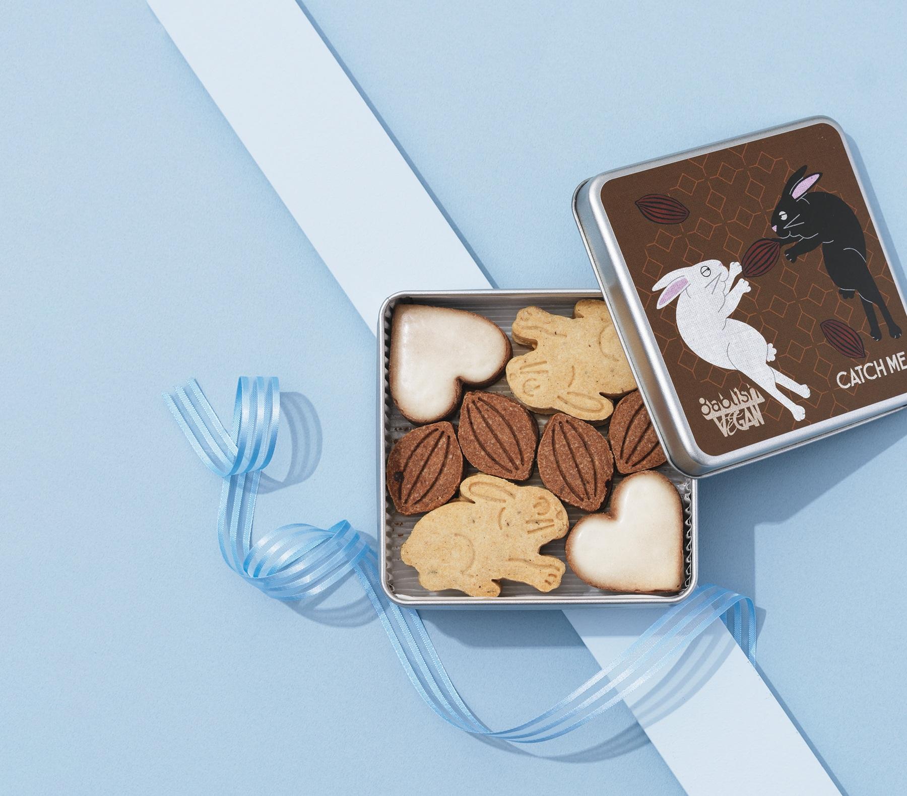 ヴィーガンの食品を扱う人気ブランド。うさぎをかたどったバニラクッキーとビターなカカオの風味が味わえる有機チョコチップクッキー、有機ココア生地のアイシングハートクッキーの3種詰め合わせ缶。ほろほろほどける口当たりと優しい甘さが特徴で、子供から大人まで楽しめる。