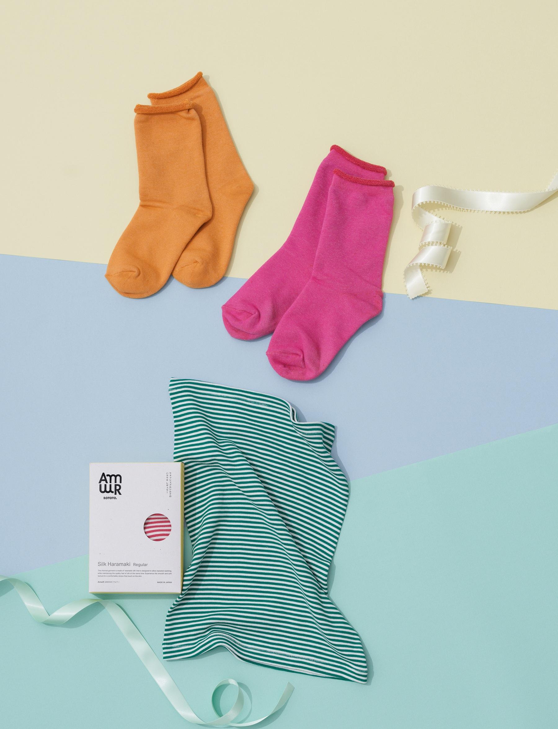 ソックスは全5色。肌に当たる内側をシルク糸でパイル編みにしてクッション性と保湿性を高め、表面にはオーガニックコットン糸を使用して靴との摩擦を軽減し、耐久性を向上。ハラマキは、柄と単色の全9種。冬場はしっとり暖かくお腹を守る。