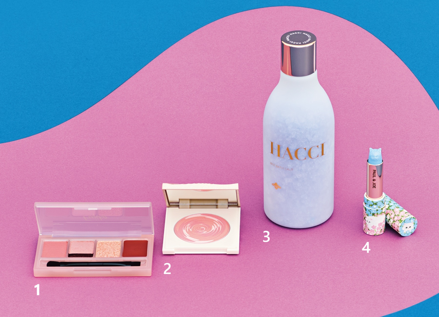 写真左から、① Fujiko「マルチイージーパレット 03」、② COVERMARK「ライティング カラー パウダー 03」、③ HACCI「BEE バスソルト ドラマティックハニー」、④ PAUL & JOE「スパークリング リップスティック リミテッド 002」