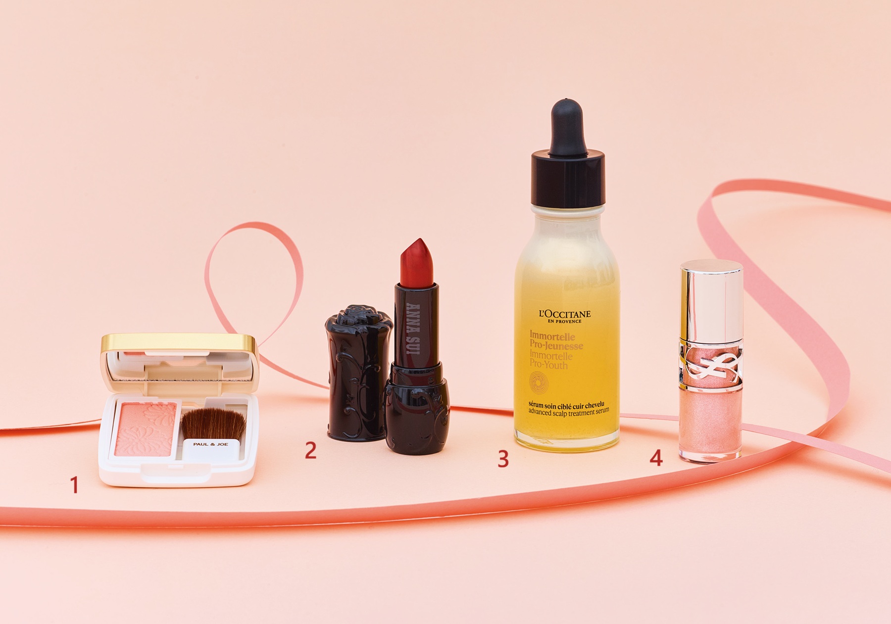 左から ① PAUL & JOE BEAUTE「フェイスカラー ブラッシュ 02」、② ANNA SUI「リップスティック 601」、③ L’OCCITANE「イモーテル プロユース アドバンストスカルプセラム」、④ YVES SAINT LAURENT「YSL ラブシャイン グロスプランパー #10」