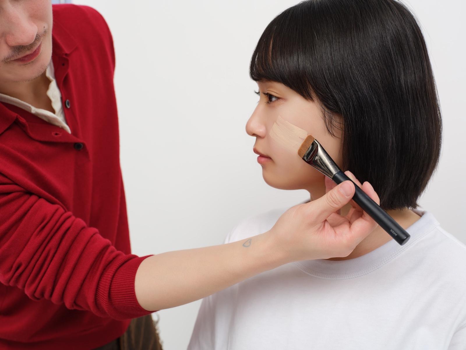 - リキッドファンデーションを頬の中心にのせる。ブラシで顔の中心から外側に向かって、均一になるように伸ばしていく。
