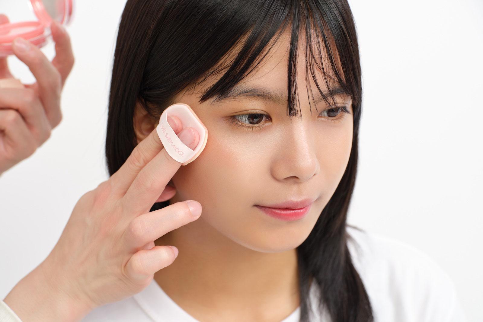 - オレンジのクッションチークを黒目の外側から頬骨に沿って、上に向かってのせていく。