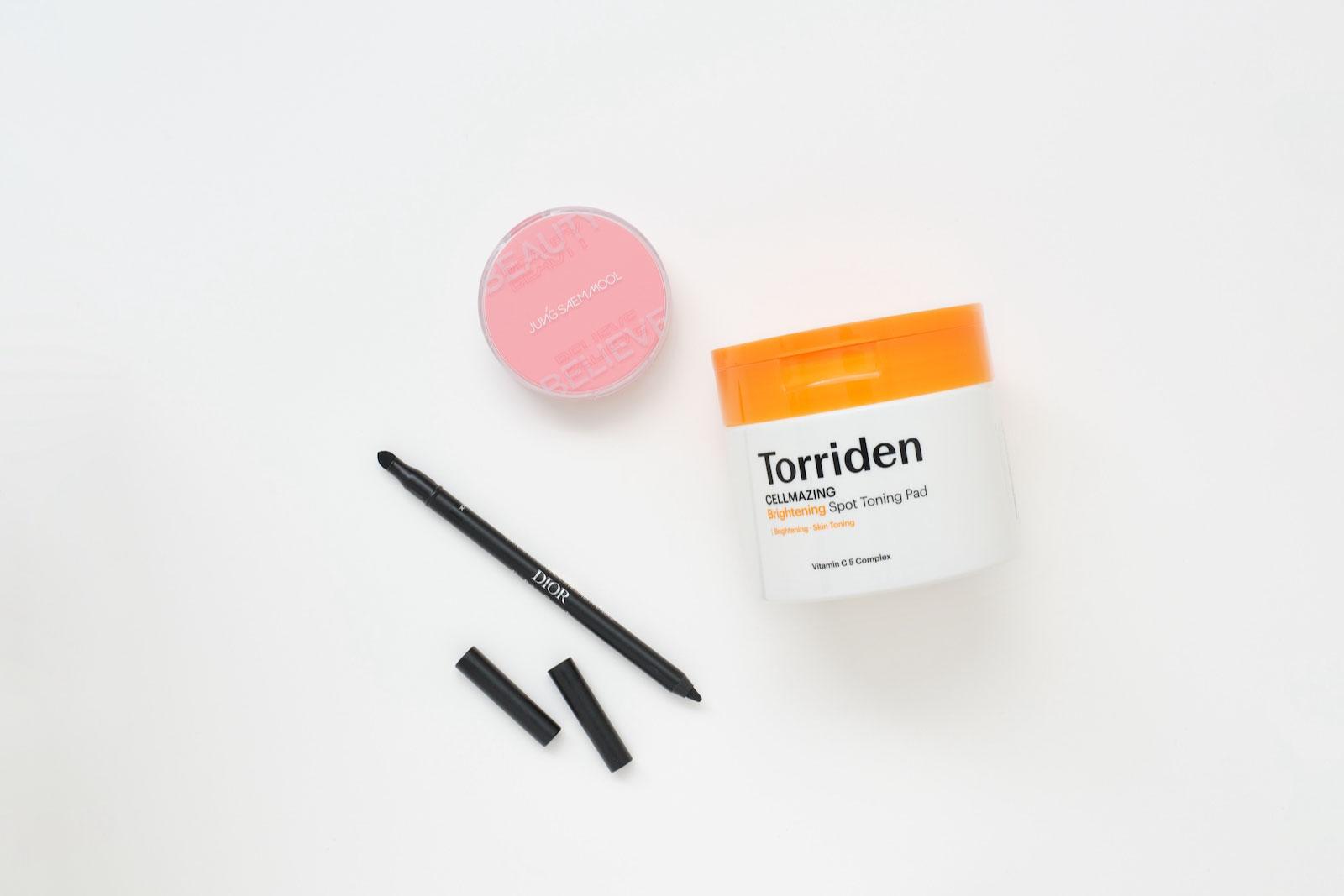 左下から、ディオールショウ オンステージ クレヨン ウォータープルーフ 099 ¥4,510 ※シャープナー付き(パルファン・クリスチャン・ディオール TEL.03-3239-0618)、JUNGSAEMMOOL アーティストクッションブラッシュ Coral Halo ¥1,980(韓国高麗人蔘社 TEL.03-6279-3606)、Torriden セルメイジング ビタC トーニング パッド ¥2,530(マルマンH&B TEL.0120-040-562)