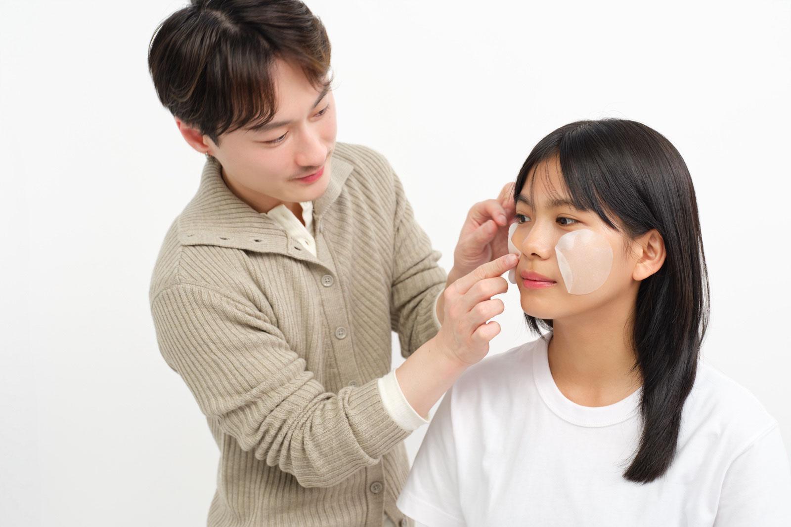 - トナーパッドを2枚取り出し、頬にのせる。このときにほうれい線のところを折り返して、部分的に重なるようにのせるのがポイント。