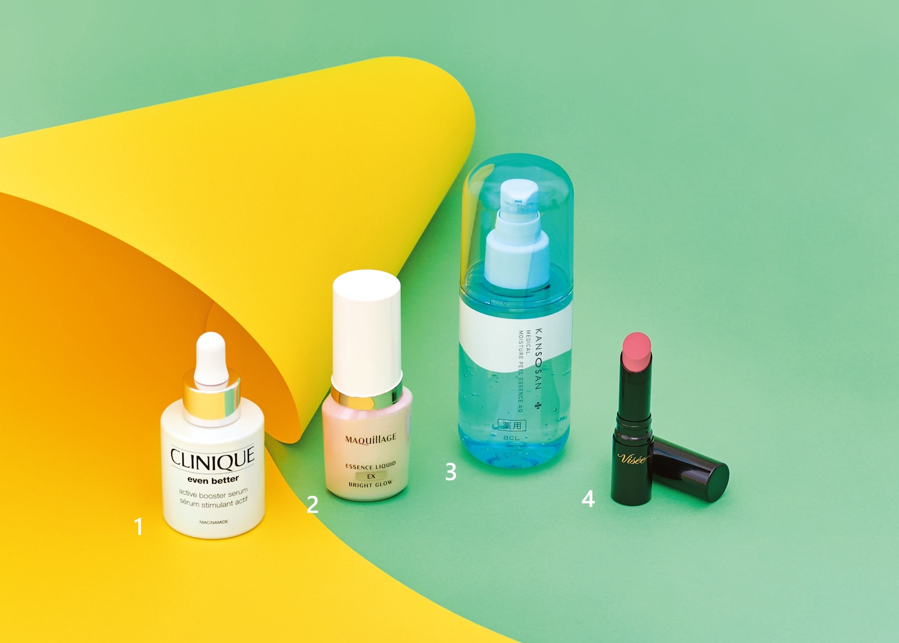 左から ①CLINIQUE「イーブン ベター アクティブ ブースター セラム」、②MAQuillAGE「エッセンスリキッド EX ブライトグロウ」、③KANSOSAN「薬用水分力ふき取りエッセンス」、④Visee「ネンマクフェイク ルージュ II PK850」