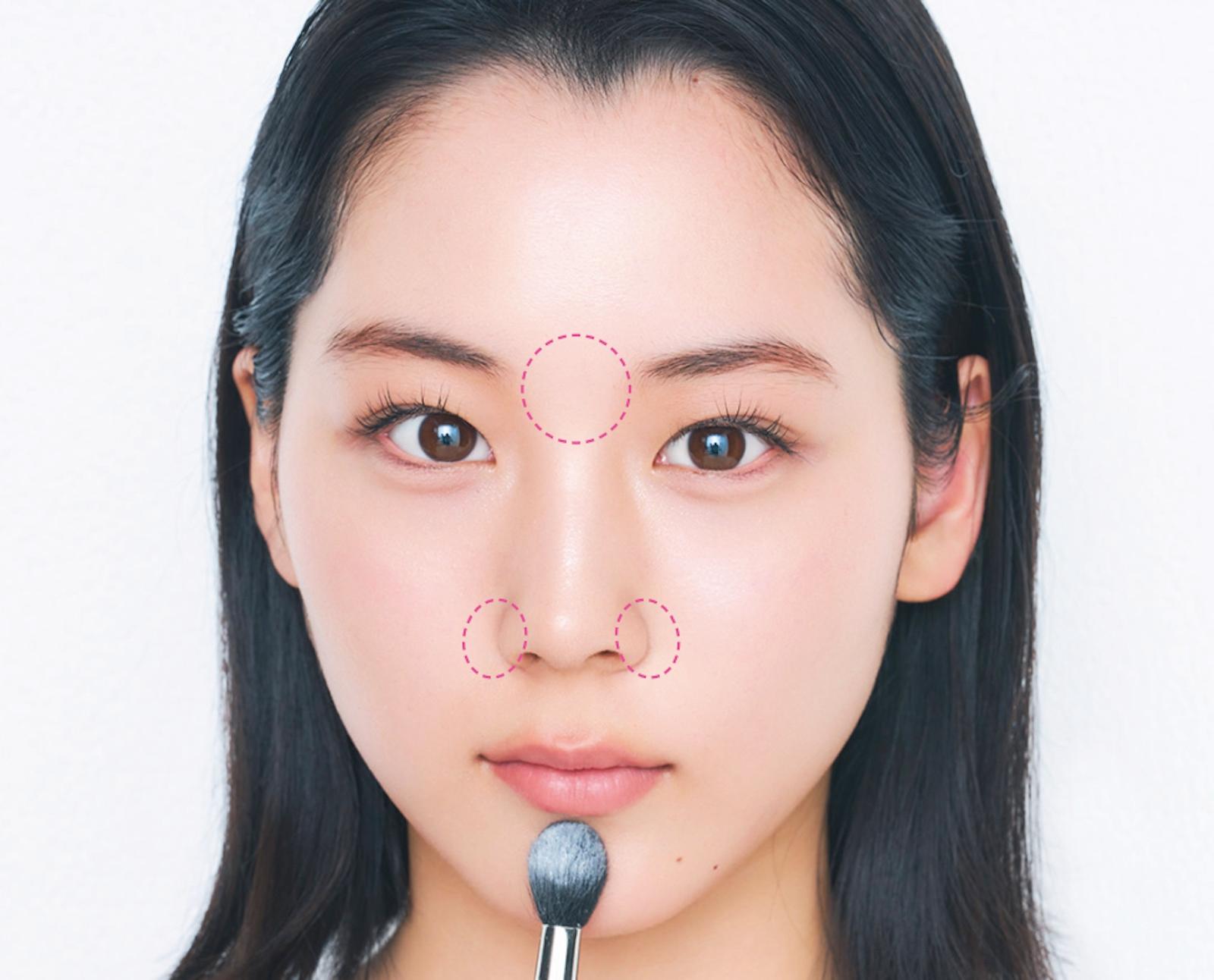 眉間、小鼻、顎先にブラシでふんわり重ねる/毛脚の長い小さめのブラシにパウダーを含ませたら、皮脂が出やすい眉間と小鼻、顎先にふんわりのせる。カラーレスのパウダーを選べば白浮きも気にならない。