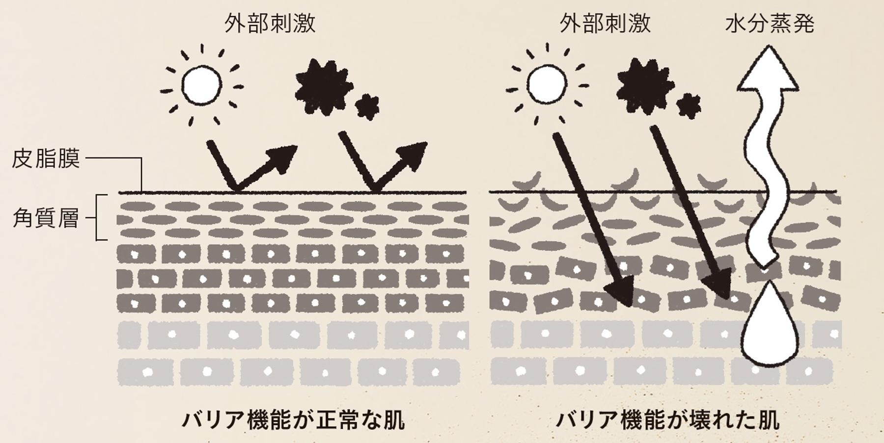 紫外線や大気汚染物質などの外部刺激から肌を守り、内部の水分蒸発を防ぐ働きが角質層に備わる「バリア機能」。低下すると肌の水分が失われ外からの刺激も受けやすい状態になり、炎症などの原因に。