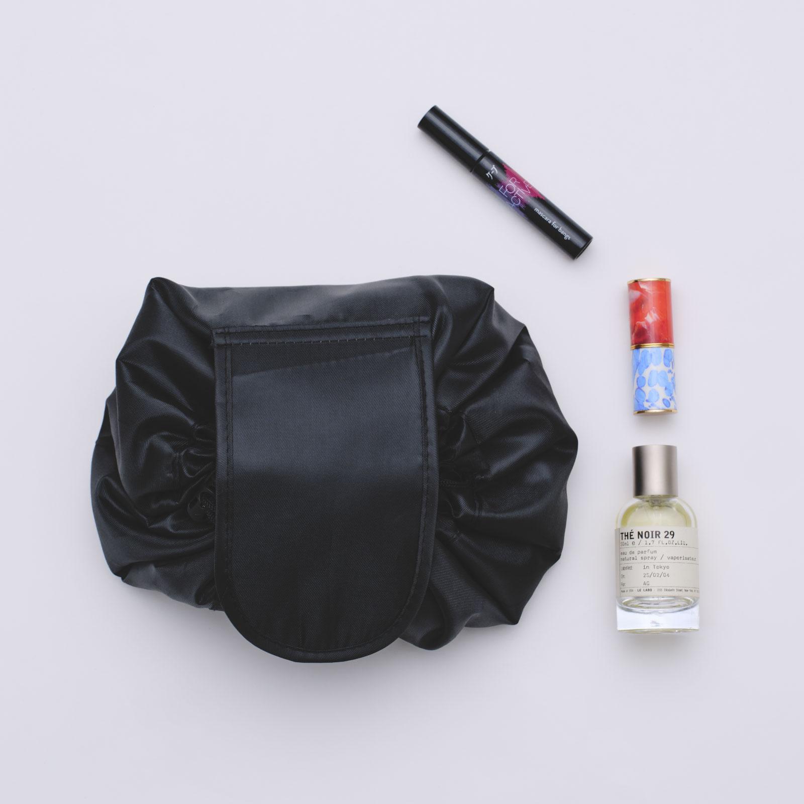 私のポーチ選びは機能性重視で、これは中⾝が⼀気に⾒渡せる点が最⾼(笑)。最近の愛⽤コスメでいうと、まず外せないのが〈ドリス ヴァン ノッテン〉のリップスティック。パッケージが可愛すぎる上に、どんな服にでも合わせやすいカラーなの。〈Le Labo〉の「THÉ NOIR 29」はとんでもなくいい匂いで、妖精になった気がするくらいすっごく軽やかなんだよね。あとは、〈ケープ〉の「FOR ACTIVE 前髪ホールドマスカラ」も私のヘアメイクに⽋かせないアイテム。アホ⽑もフィックスできるし、前髪の内側がうねっちゃう⼈にもオススメ。私は部屋の⾄る所にこれを置いてるよ(笑)。