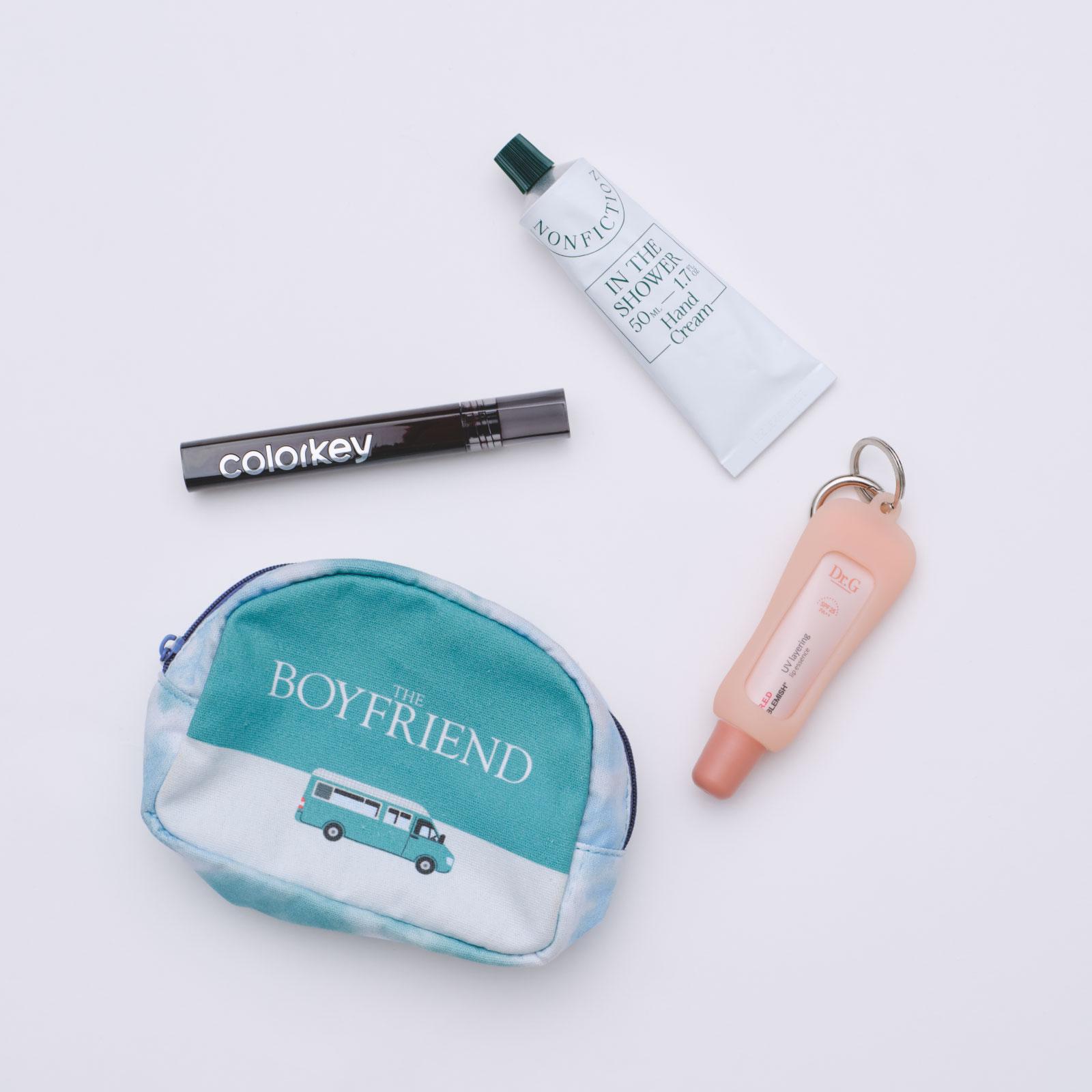 このポーチは、〈ニコアンド〉と『ボーイフレンド』のコラボアイテム(笑)。職業柄ハンドクリームが必須なんだけど、イチオシは〈NONFICTION〉の「インザシャワー」。ベタベタしないし、⾹りもめっちゃいい! リップは中国コスメの〈colorkey〉を愛⽤。ちょっとレンガっぽいカラーで、⾊持ちもいいの。保湿⼒が⾼くてUVカット効果もある〈Dr.G〉の「レッドブレミッシュUVレイヤリングリップエッセンス」も、必ず持ち歩いているもののひとつ。2⾊あって、02は⾃然な⾎⾊感が出るコーラルカラー。