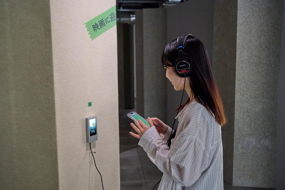 4Fの「映画は、森だ。with 牛尾憲輔」は、ほかのフロアとはまた違う、静けさに包まれた空間。複数の柱が並んでいるが、それらは森の木を連想させる。そして、その1本1本に設置されているは、オーディオプレイヤーとヘッドホン。