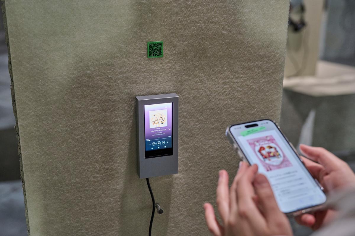 オーディオプレイヤーにセットされているのは、音楽家・牛尾憲輔が“映画音楽”という観点でキュレーションした21作品のサウンドトラック。そのラインナップは、洋画、邦画、新旧と多岐に渡るが、それらは牛尾氏が過去に影響を受けた作品や、自身が音楽を担当した作品などから選ばれているそう。柱にはQRコードがついていて、そこにアクセスすると、映画の概要に加えて、牛尾氏による映画音楽としての秀逸さを解説する文を読むことができる。