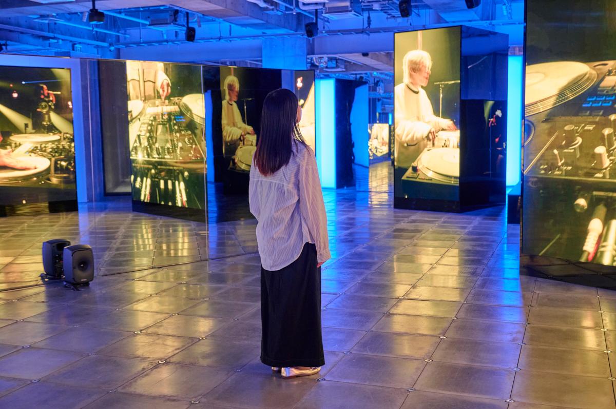 ここで目にするのは、鏡に囲まれた空間と、タテ、ヨコサイズの異なる8台の特大LEDディスプレイ。画面にはCreepy Nutsのライブパフォーマンスなども含まれた、このプログラムのために制作されたオリジナルコンテンツが映し出されている。さらに、約20台ものスピーカーによって構成される立体音響との相乗効果で、ライブさながらの臨場感!