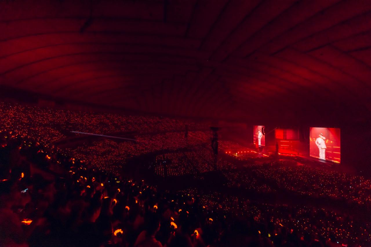 開演時間を10分ほど過ぎた頃、『Übermensch』収録の『TOO BAD (feat. Anderson .Paak)』のミュージックビデオが映し出されると、花言葉に「平和」を持つ花・デイジーを模したペンライトに明かりが灯り、花畑のように揺れ始める。『TOO BAD』が終わると暗転。抽象的なモチーフとメッセージがちりばめられたVCRから、赤く染まった会場にバンドが重低音を唸らせて『POWER』が鳴り響く。割れんばかりの大歓声の中、ステージ上のLEDパネルが上がるとその奥から、頭に王冠を乗せ、サングラスをかけたG-DRAGONが立て膝でこちらをじっと見据えて登場! それは紛れもなく“王”の帰還を宣言した瞬間だった。バラの花をつなげた真っ赤なジャケットとブラックのブーツカットパンツを着こなし、スペシャルアレンジの『POWER』で会場のボルテージはあっという間に沸点に到達! 続いて会場に青いレーザーが乱れ飛ぶ中スタートした『HOME SWEET HOME (feat. TAEYANG & DAESUNG)』では歓声はさらに大きく轟き、会場がひとつになって大合唱。その光景にG-DRAGONも時折笑みを浮かべながら熱くパフォーマンスすると、早くもこの日最初のクライマックス!