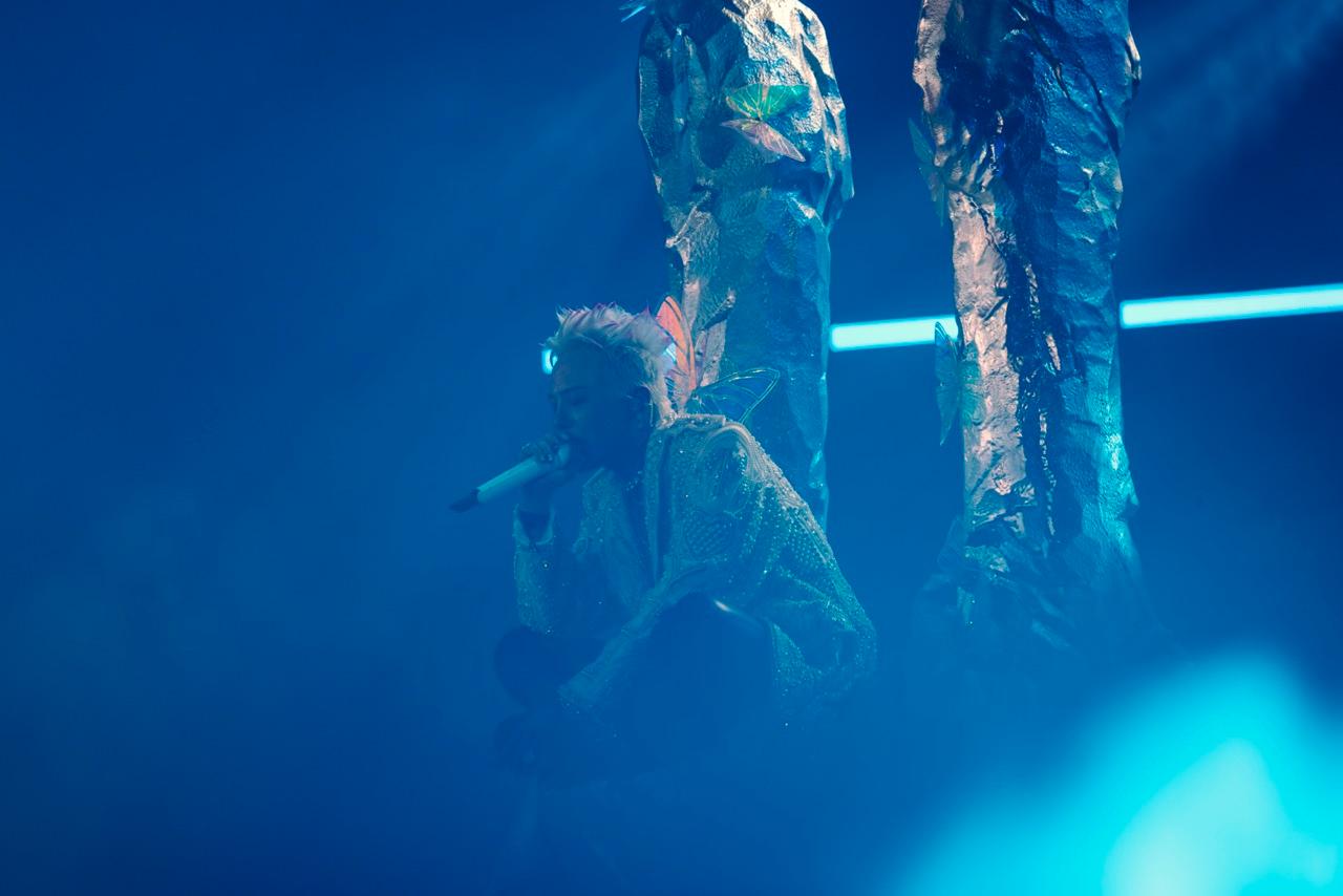 ふたたびVCRを経て、ビジューがちりばめられた白のロングジャケットを纏い、白いハンドマイクに持ち替えたG-DRAGONが登場すると、メインステージに座り込んで『BONAMANA』がスタート。冷たく張り詰めた空気が漂うステージは低体温な楽曲にフィットし、センターステージからせり上がる階段で歌い上げる姿は、ある種の神聖さすらたたえていた。すると今度は鳥のさえずりが。朝のまどろみのようなドリーミーなイントロから、2009年リリースの1stアルバム『Heartbreaker』収録の『BUTTERFLY』へ。メインステージに移動すると、登場したセットに腰かけ、体をゆったり左右に揺らしながら歌う。