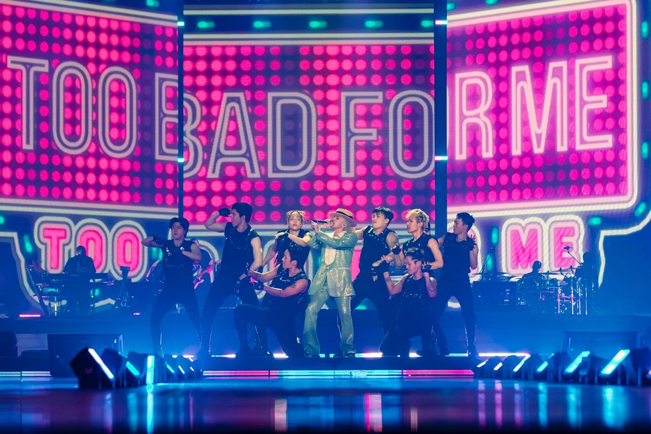 「You got me!」の掛け声を合図に、80年代風のトラックにG-DRAGONの柔らかなボーカルが乗る『TAKE ME』をセンターステージの階段でプレイ。ステップを踏む姿と心地よいビートに会場も軽やかに体を揺らすと、ソリッドなドラムから『TOO BAD』へ。ライブ用にアレンジが加わったブレイクでおもむろにマイクを置き、帽子をかぶり直すとソロダンスタイムに突入! G-DRAGON得意のフットワークで会場の盛り上がりをかっさらうと、ラストはボウアンドスクレイプでエレガントに仕上げたのだった。