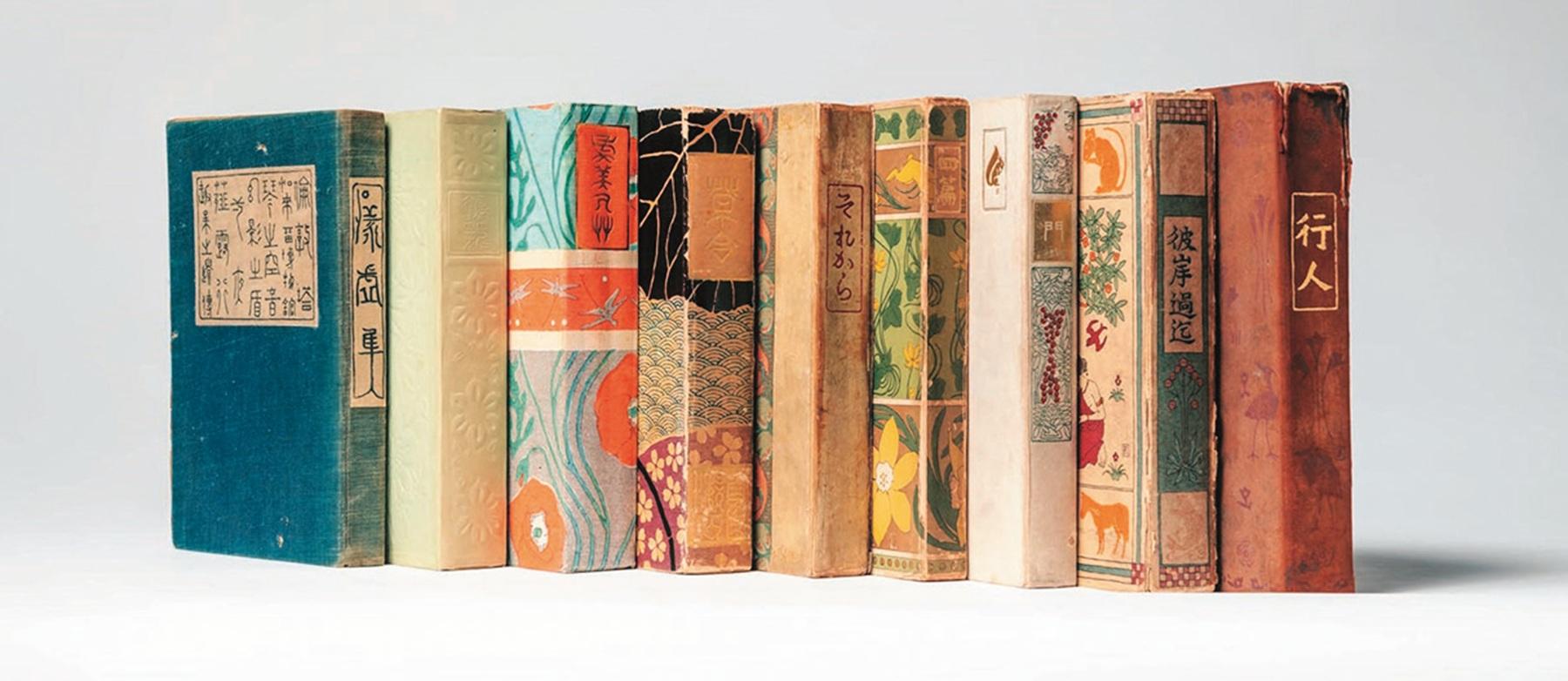 漱石本の中には『行人』などスエードが一部使用されている逸品も。