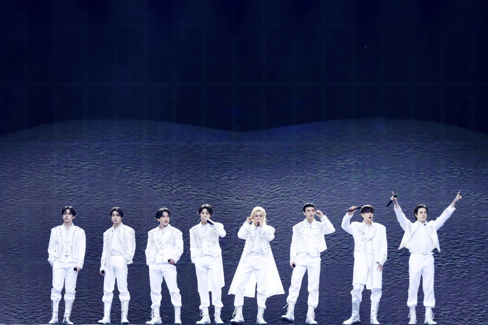 この日はあいにくの曇天模様。そんなエコパスタジアムに「Stray Kids」のシャウトが鳴り響く。それに呼応するかのようにペンライトを上下に揺らすSTAY(Stray Kidsのファンネーム)。ステージに設置された大型モニターには巨人のごとき大きさでメンバーたちが次々と映し出され、Lee KnowとSeungminがモニターから身を乗り出すように客席を覗くシーンも。ステージに剣をふるう男が現れ、その動きに合わせて太鼓が打ち鳴らされる中、Stray Kidsと書かれた旗を掲げるマーチ姿のダンサーたちが登場。ふと音が止まり、スクリーン中央の巨大な口が開くと、中から金で縁取られた真っ白なナポレオンジャケット衣装のメンバーたちが現れた。