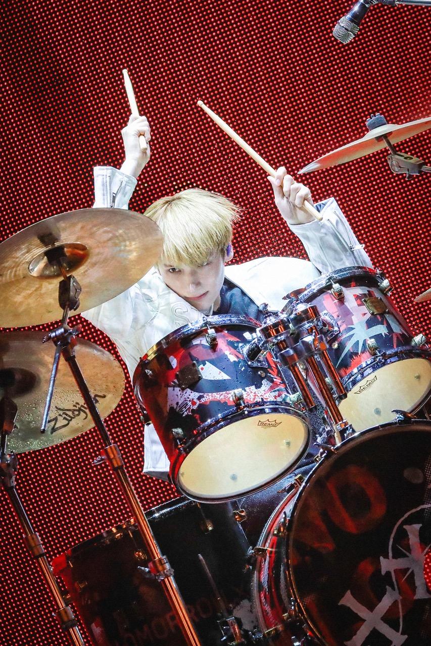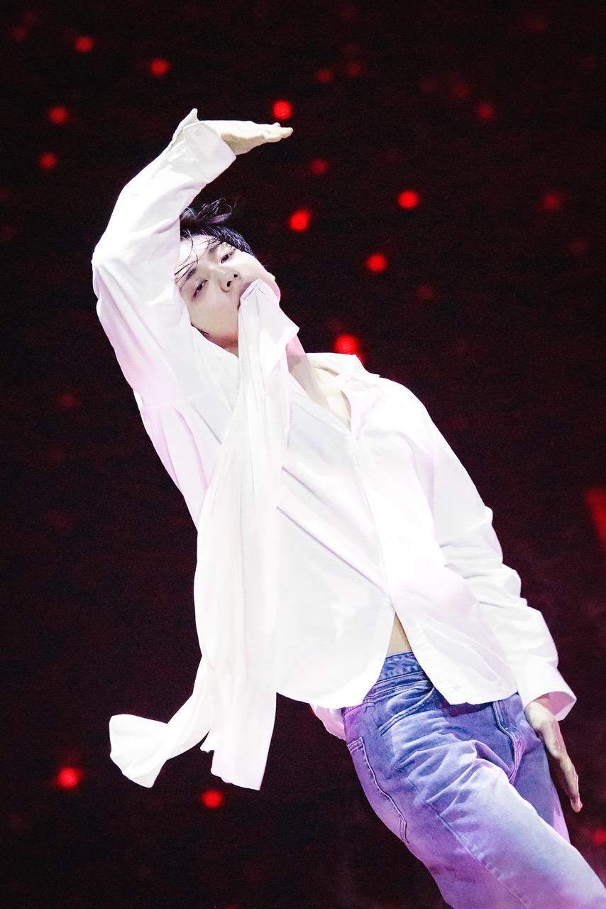 HUENINGKAIは水しぶきを上げならドラムを叩くという演奏パフォーマンスで美しさと激しさを表現。「東京が最後の公演なので、スペシャルなバージョンで準備しました」と、水にこだわったことをのちに明かした。SOOBINは「Dreamer」に入る前にソロパフォーマンスを披露。白シャツにデニムというシンプルな衣装に目隠しという姿でステージに現れると、ピアノのメロディと共に白い布をまとわせたり、口に布をくわえて舞う姿は今にも消えてしまいそうな儚さがあった。