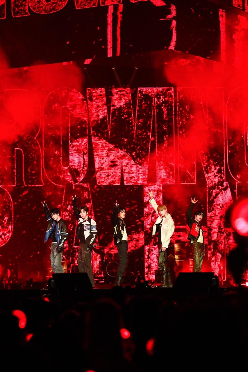 コンサートもいよいよ終盤へ。壮大なイントロから始まった「Good Boy Gone Bad[Japanese Ver.]」は真っ赤に燃え上がった会場の中心でBADBOYな表情を見せ、YEOUNJUNが「メイク・サム・ノイズ!」と叫ぶとアリーナが揺れるほどの大歓声が湧き上がる。「Growing Pain」ではHUENINGKAIがシルバーのエレキギターとピックを放り投げ、頭を振りかぶりヘドバンするハードなパフォーマンスを見せ、最後は5人揃ってメロイックサインを掲げてステージを去っていった。