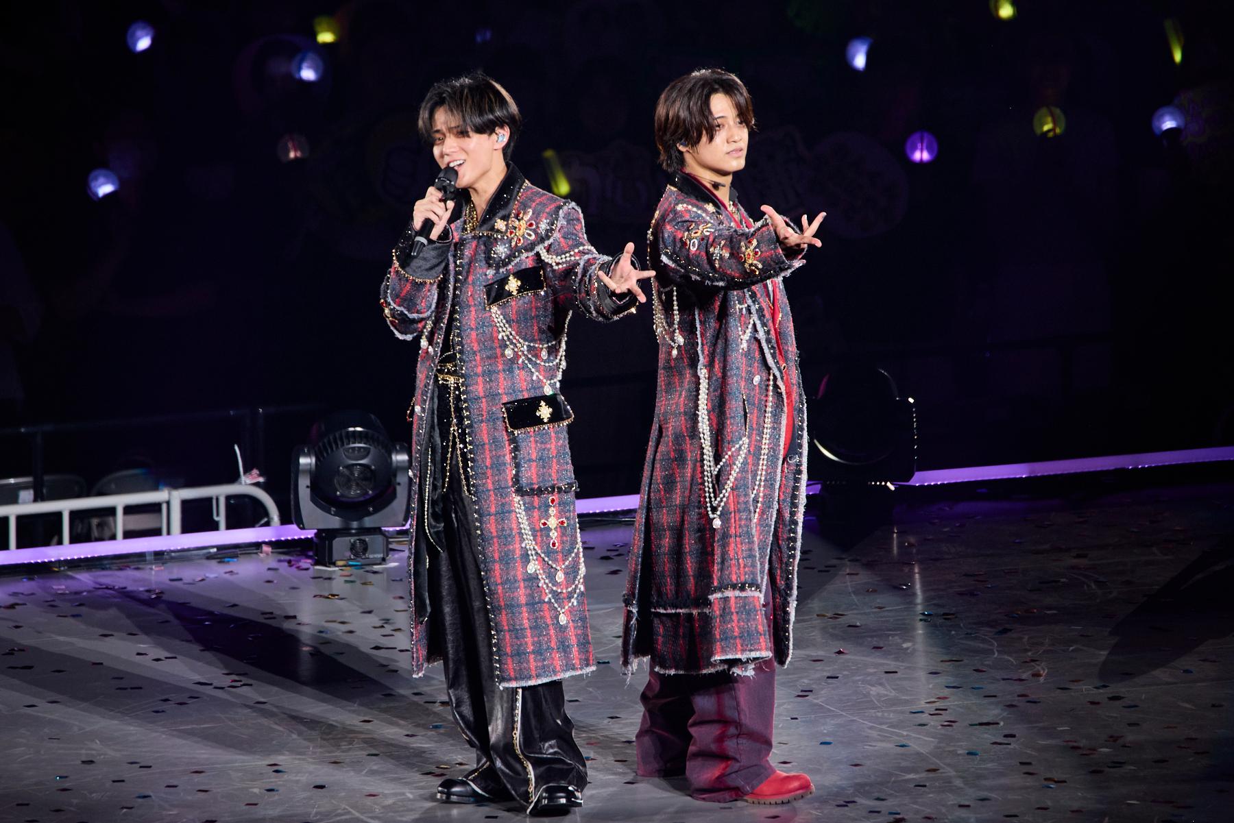 星空が美しく輝くスペーシーなセットで、東京ドームが壮大な宇宙空間に。黒を基調として宇宙服のような衣裳を身に纏った永瀬廉さんと髙橋海人さんがステージに登場すると会場に割れんばかりの大声援に包まれる。1曲目は「LOVE HACKER」から。今回のツアーは、アルバム『Re:ERA」の世界観を軸に構築。ふたりが細部にまでこだわって手掛けた演出、衣裳、セットリストで創り上げたスペシャルなステージだ。