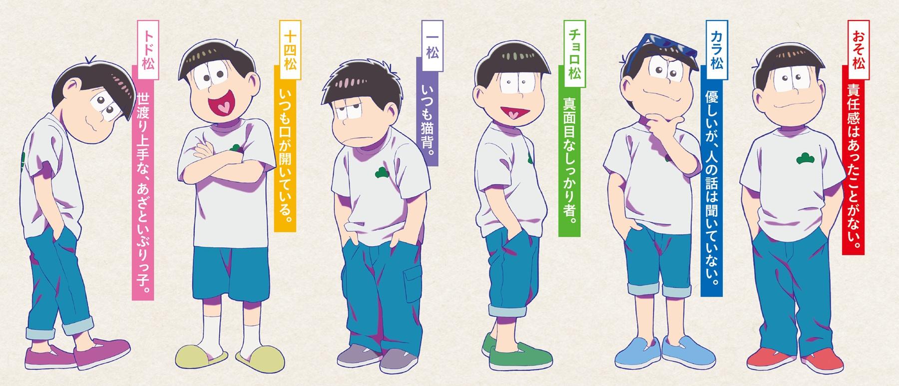 とどまつ 松野家の末っ子。ニートで童貞。愛称はトッティ。世渡り上手な愛されキャラ。5人の兄に流されず、我が道を行きたいタイプ。自分が大好き。一人だけなぜかスマホを持っている。CVは入野自由。