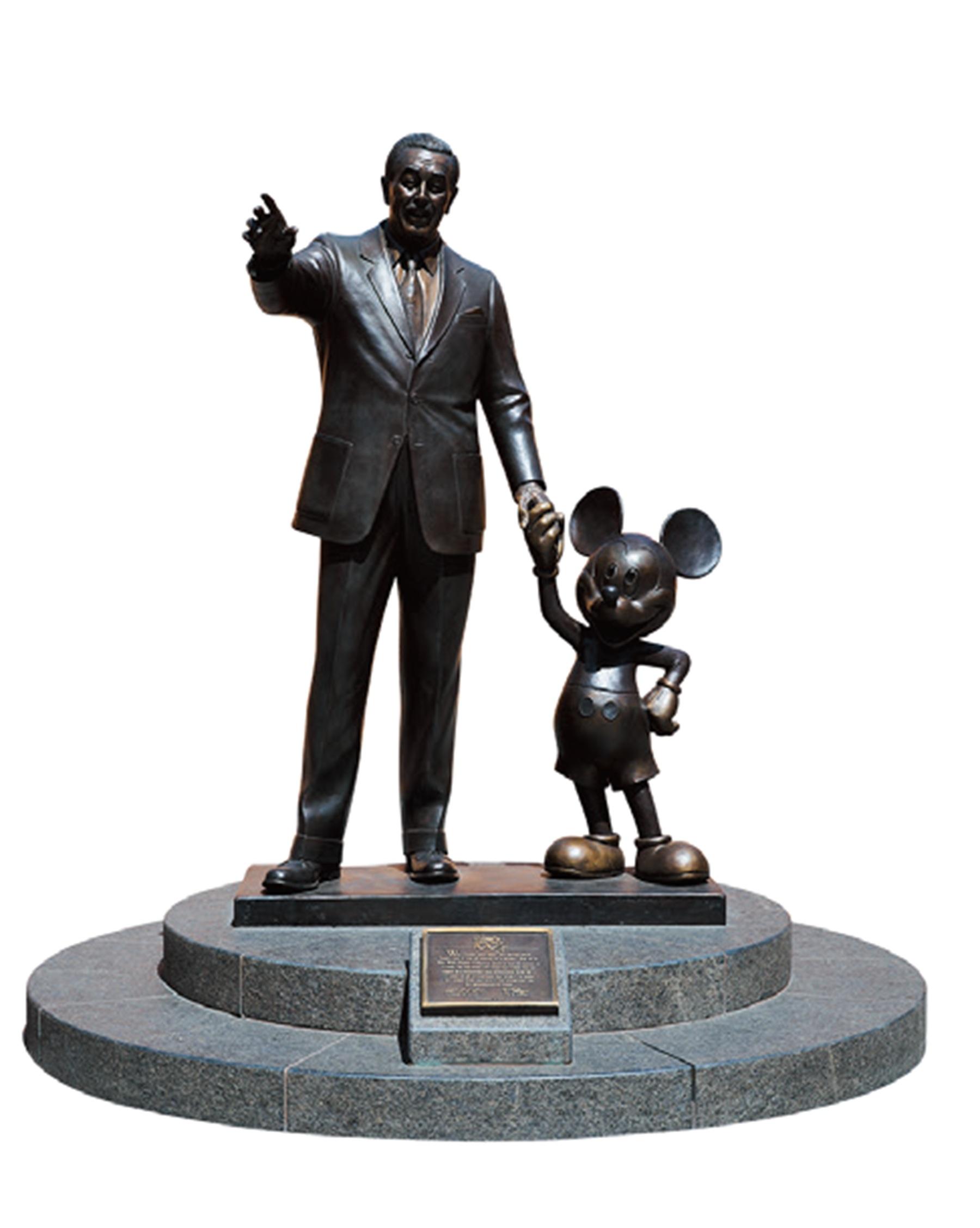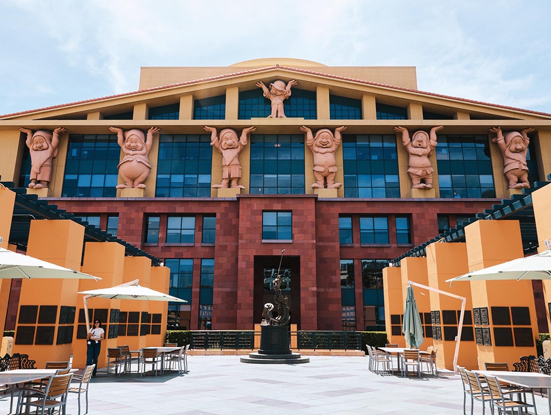 『白雪姫』(1937年)の収益で建てられた本スタジオを象徴する、7人のこびとが支える本社ビル「チーム・ディズニー・ビルディング」。正面にはウォルトとミッキーの銅像を中心に広がる「ディズニー・レジェンド・プラザ」が。俳優や製作陣などディズニーの歴史を支えたあらゆるレジェンドたちの手形やサインが並んでいる。