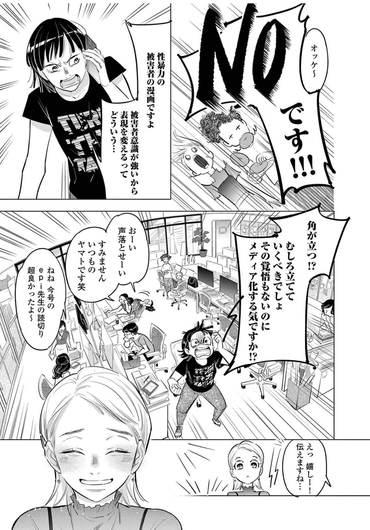 「子どもを持つかどうか…の編集長の話は、実際私の身の回りにも同じことで悩んでいる人がたくさんいて、その中の1人が“最終的に子どもを持つという結論になるストーリーが、世の中に溢れすぎている!”と怒っていたんです。それを聞いて、持つか持たないかは個人が自由に決められる社会がいいと思ったし、もちろん持つ結論の物語が悪いわけでは決してないんですが、持たないという選択肢を取った人たちがいることも言っていくべきなのでは、と思い、描いたエピソードです」