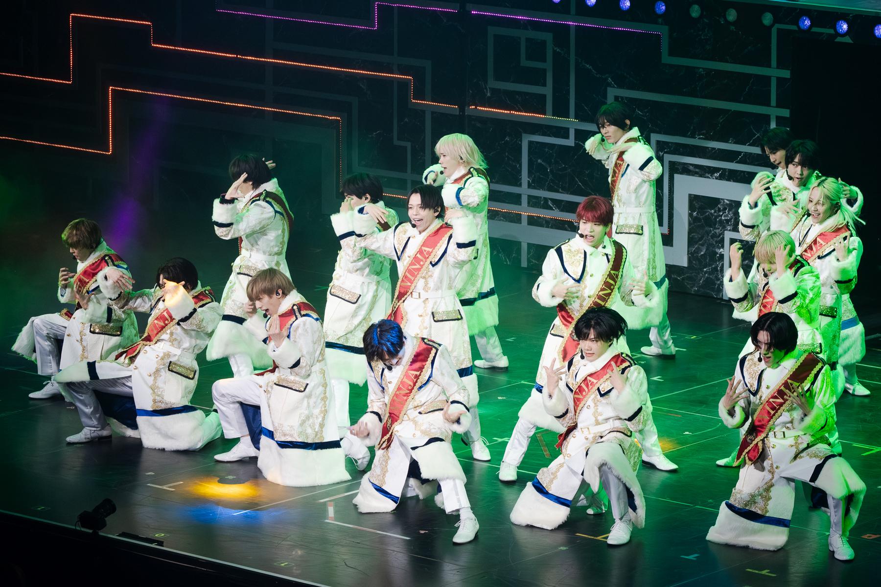 オープニングはメンバーが登場してライブマナーの注意喚起を楽しくレクチャーする映像からスタート。次の瞬間、紗幕がハラリと落ち、ドラマティックにライブの始まりを告げるとムービングステージに16⼈が堂々登場。“NINJA”と刻まれた⾚い襷がかかった⽩の⾐裳に⾝を包み歌ったのは、オリジナル曲「Dreamers」だ。タイトル通り、“This is 忍者”といわんばかりにパッション全開のアクロバットを盛り込んだダイナミックなダンスが魅⼒のこの曲。めまぐるしく変化するフォーメーションとヴァサイェガさんと元⽊さんの畳みかけるようなラップが観る者のボルテージを加速させる。ラストは横⼀列に並び、⽩のジャケットから⻘いジャケットに⼀瞬で16⼈が早替えする、まるでマジックのような⾐裳チェンジに驚かされた。