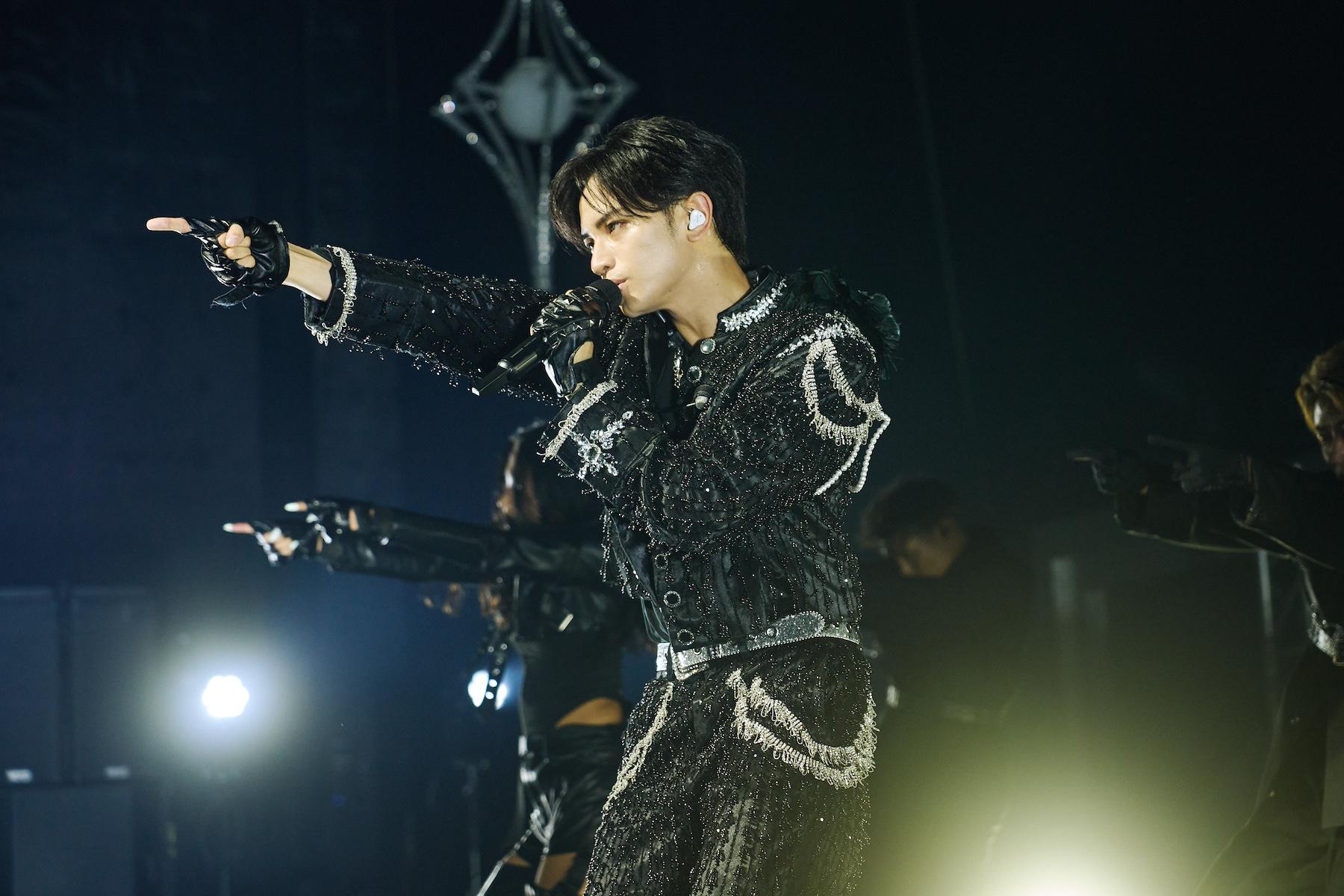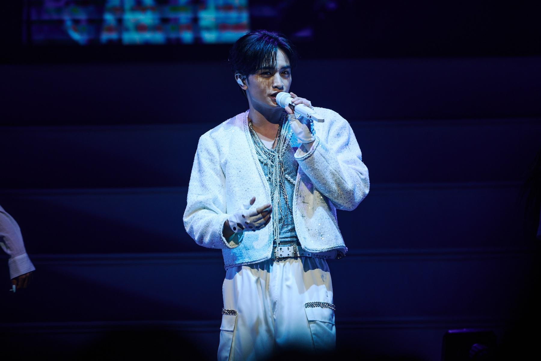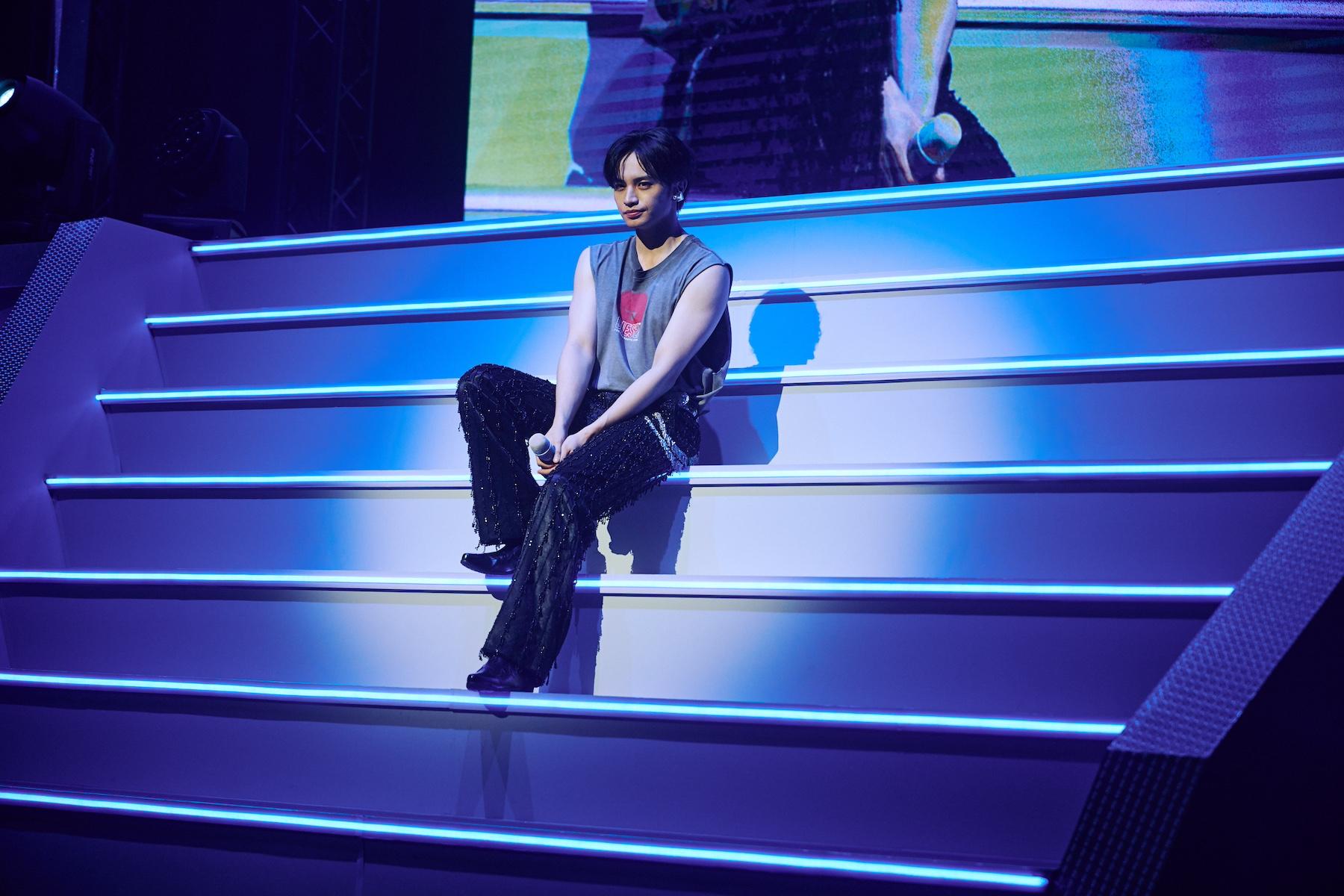 着替えも終わり、ここからは、台北公演に⾄った想いを直接ステージ上で説明。「⼈⽣で初めての海外公演なので、嬉しいです。今、⽣配信で台北の⽅、⽇本のファンの皆様も観ていますので、ちょっと⽇本語で喋ろうかな。準備をたくさんしてきて、昨⽇は台北ドームで歌ってきました。観てくれたって⽅? 台北ドームに⾏ったっていう⽅?」と会場に尋ねると「はーい」という⼤きな返事が返ってくる。「オーマイガー! アメージング! いやー、すごい。やっぱり歓声を主⾷にしてる⼈間なので。皆さんの歓声が僕にとってはプロテインなので(笑)」とリアルな反応に⼤喜び。