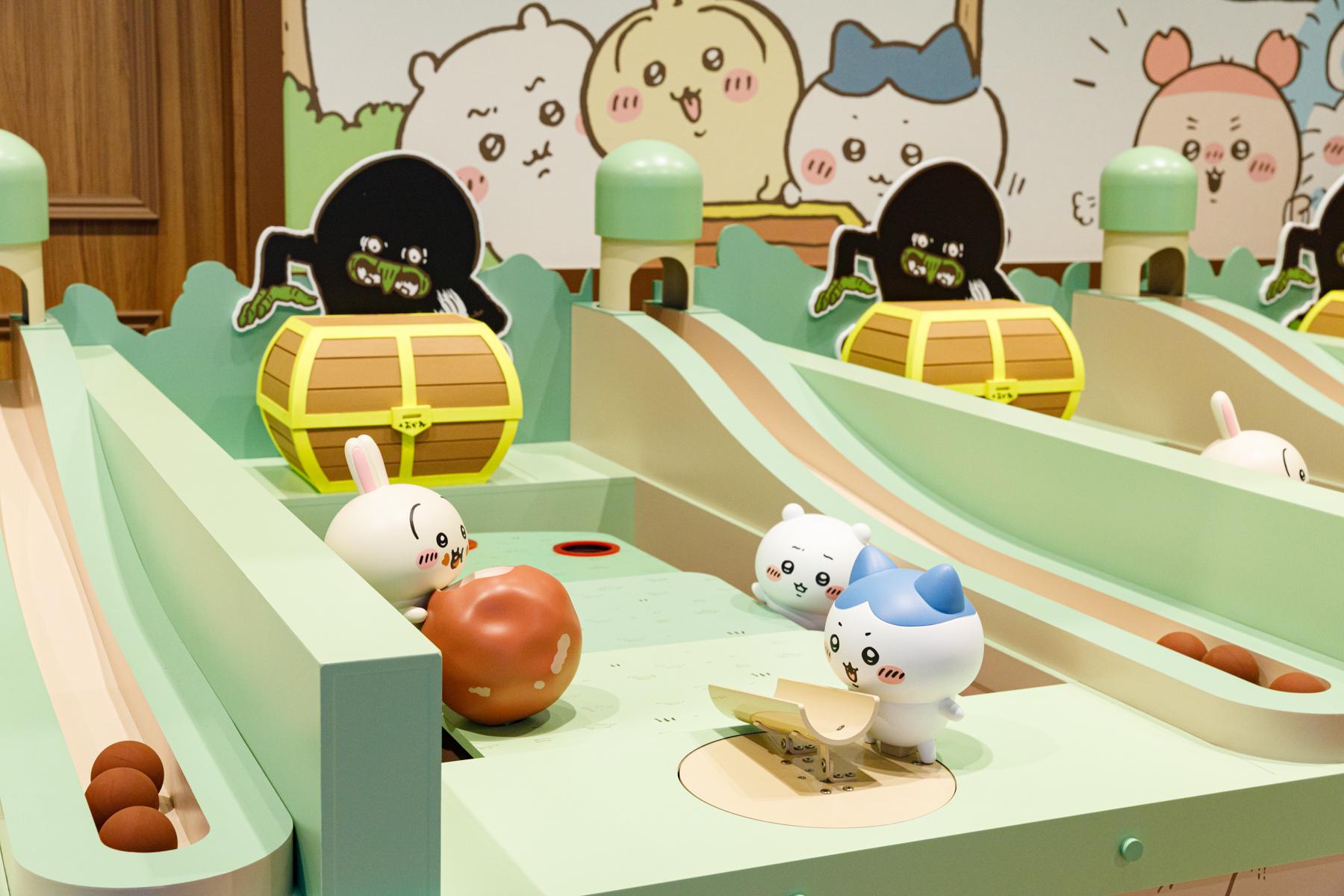 「くものすキャッチャー」は、妖精のちいかわたちをくものすに向かって飛ばし、捕獲するというもの。「ミートボールころがし」は、ミートボールが穴に落ちるように狙いを定めて転がして。クリアできなくても参加賞がもらえる。