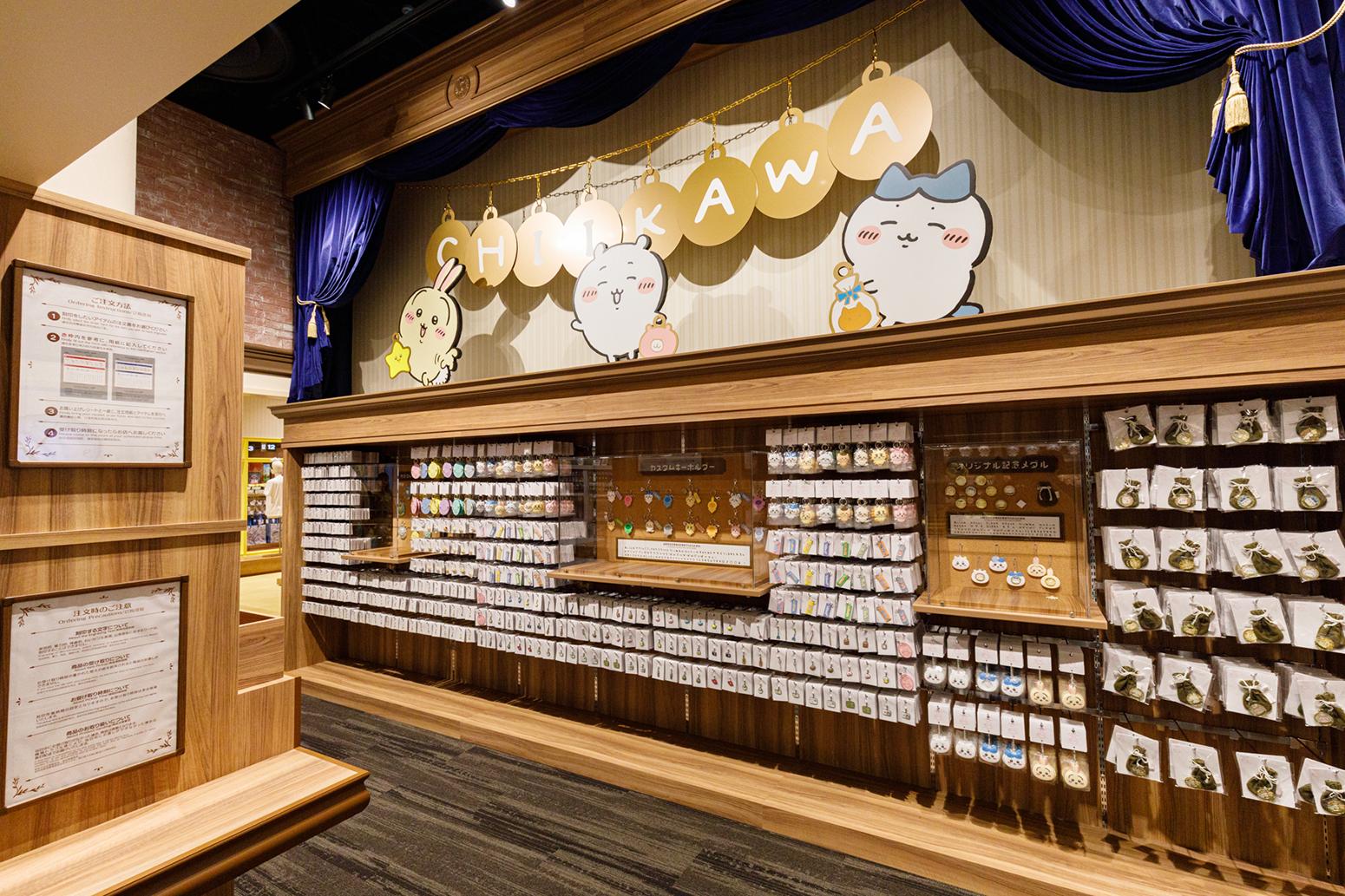 ショップエリアでは、ちいかわパーク限定グッズをはじめ、さまざまなアイテムが並ぶ。好きなパーツを組み合わせて名入れできるなど楽しいコーナーもめじろおし。