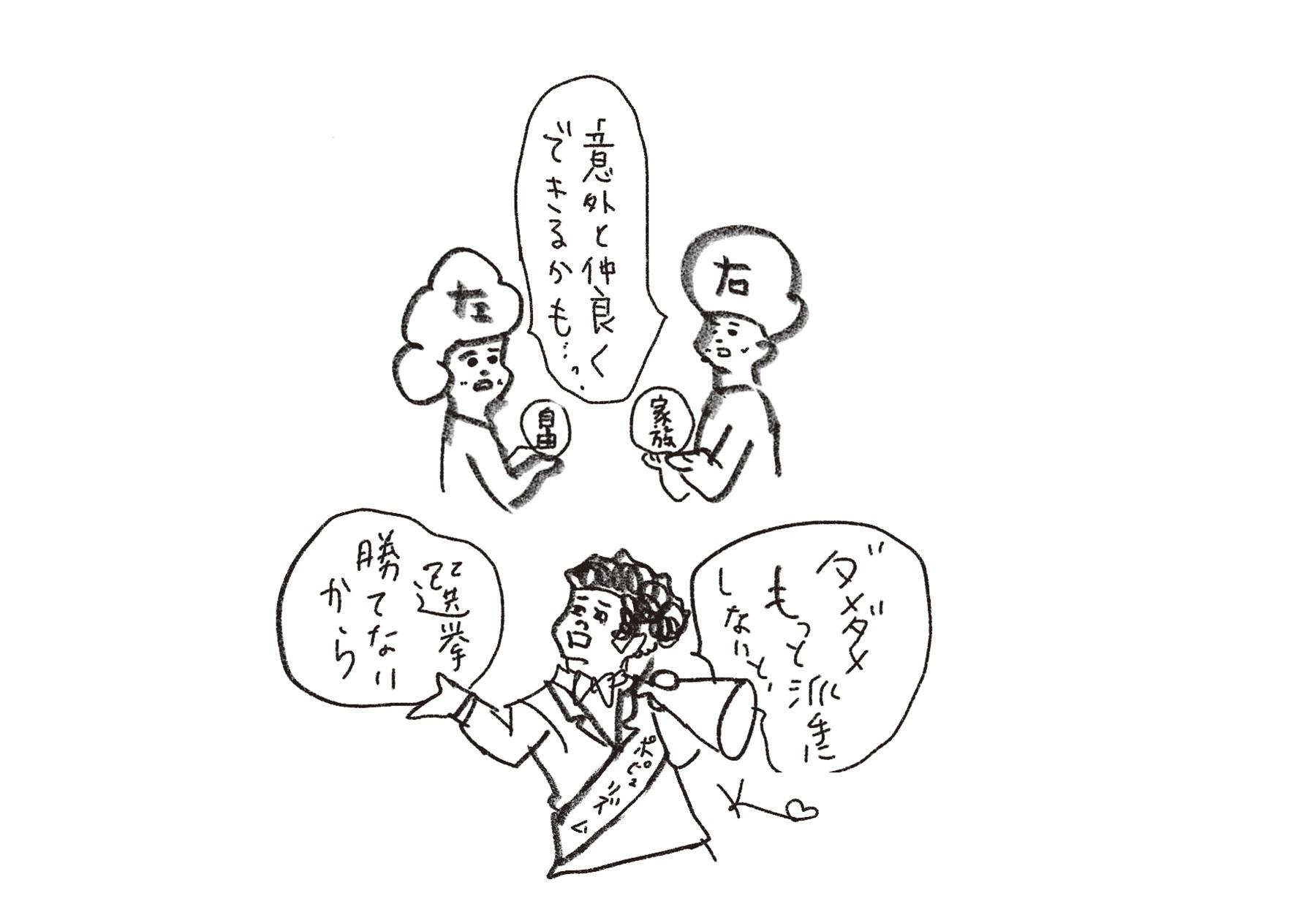 右派も左派も、そもそもは対立するものではないのですね。敵に仕立てあげて勝つやり方はあんまり良くないけど、言葉の強さや派手さに目を奪われてしまう大衆もいるわけで。選挙が終わって、政治家の今の日常の姿をぜひチェックしておきたいです。