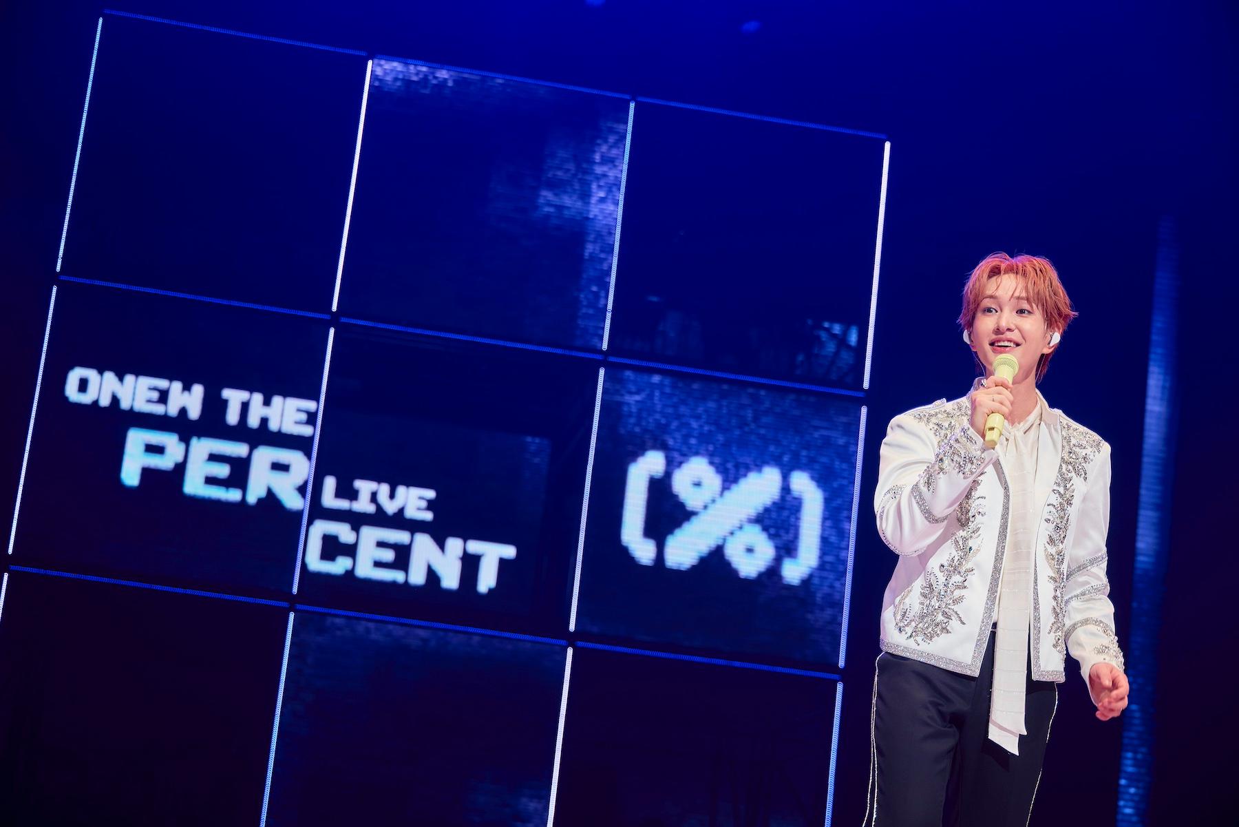 開演時間を少し過ぎた頃、客電が落ち、電脳世界で得体の知れない何かがうごめく映像がステージ正⾯のLEDに映し出される。続いて、太陽が差し込む部屋にONEWが佇む映像へと切り替わると、その部屋には⿊いルービックキューブが。それに触れるたびに時空がバグり、異なる世界線で異なる表情をしたONEWが現れる。と、公演のサブタイトルにもなっている韓国最新アルバム『PERCENT』に込めた、⼈間はあらゆるものと相互に補完する関係で、誰も⼀⼈で100%にはなれない不完全な存在であり、ONEW⾃⾝もその⼀⼈なのである、といった意味合いを視覚化したような映像で本編はスタート。その1曲⽬を飾ったのは、「PERCENT (%)」だ。LEDの背後からライトに照らされてシルエット姿で現れたONEW。そのシルエットはLEDが映し出す⽬のような映像の瞳の中⼼で宙に浮いているように⾒える。ワンフレーズ歌ってステージが暗転した後に現れたのは、ミントグリーンのツイードジャケットと⿊のパンツで、映像にあったルービックキューブを彷彿とさせる横3列、縦3段に積み上げられたキューブ状のセットの中央のセルに⽴ち、薄いクリームイエローのスタンドマイクで歌うONEWだった。四隅のセルにはバンドが陣取り、レイドバック気味なジャジーなアンサンブルに、少し気怠いONEWのボーカルが乗ってアダルトなグルーヴを⽣み出す。続いてギターアルペジオから「No Parachute」がスタートすると、ハンドマイクになって曲のビートに合わせて会場の熱を徐々に上げていく。リフトに乗って“jump”の歌詞に合わせてメインステージへと降り⽴つと、ラストはマイクを肩の⾼さから落とすドキリとする演出で楽曲の詞世界を表現した。