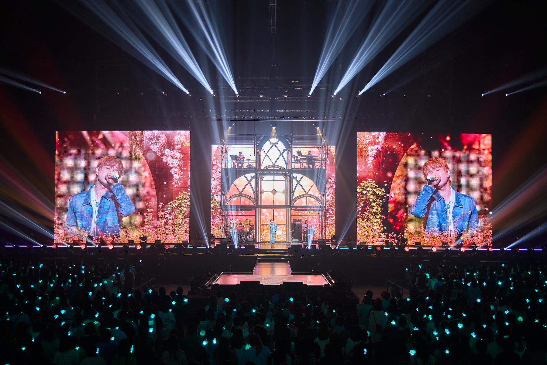 VCRを挟むと、キューブのセット中央のセルに戻り、ハイチェアに座って「Winner (Stripped Ver.)」を披露。レースのカーテンが揺れる⼣暮れ時の窓辺を表現したLEDの中、アコースティック・ギター1本と歌声だけでスタートすると、⽬をつぶりながら熱唱するONEWの、あたたかさとやさしさと、⼒強さを併せ持つ唯⼀無⼆の歌声が武道館全体に染み⼊っていく。続くMISIAのカバー「Everything」では星降る煌びやかな世界の中、ファルセットを駆使しながら伸びやかな歌声を届けると、その珠⽟の歌声に酔いしれる客席からは⻑い間、惜しみない拍⼿と⼤歓声が送られたのだった。