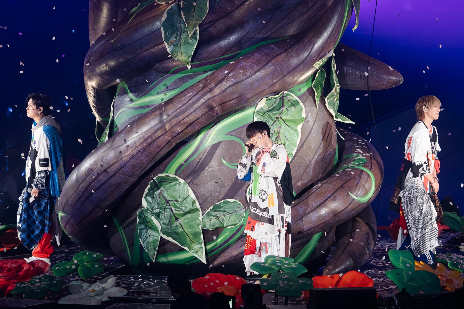 歌舞伎の⼥⽅に変⾝するような楽曲「ごめんあそばせ」では、⾚とゴールドを基調とした華やかな花魁⾐裳に⾝を包んだ3⼈。この曲では、⼥性⼝調をモチーフにした物語で、歌舞伎の⼥に変⾝。キセルや手鏡、和傘など小道具を持って歌う姿も。扇⼦をヒラヒラとさせながら、妖艶なパフォーマンスで魅了した3人。ジュニアたちは⿊⼦になってダンス。艶やかで⾊っぽい姿に会場はうっとり。