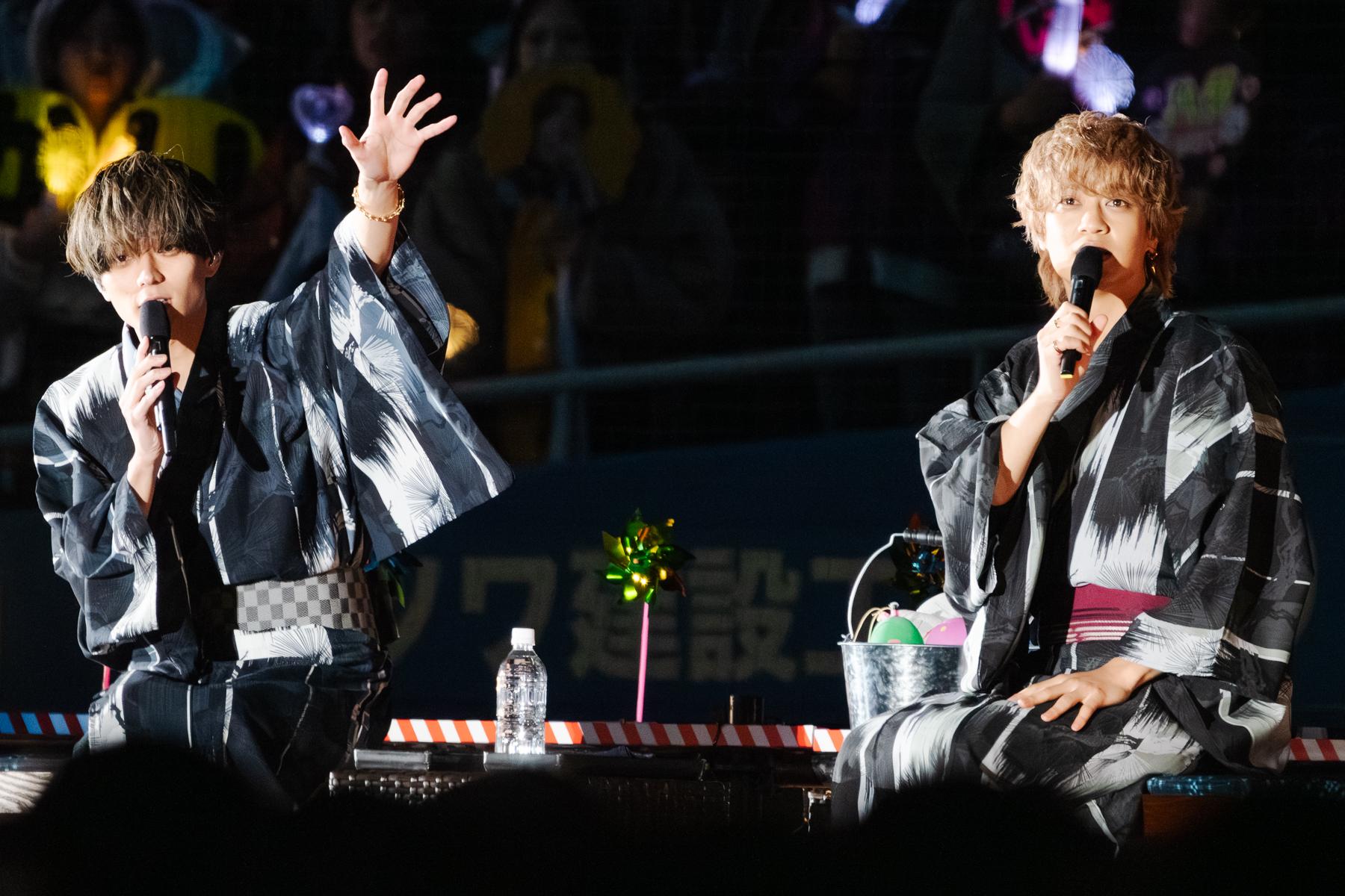 トロッコでバックステージに到着すると、永瀬さんが「さぁ、というわけで改めましてKing & Princeです。楽しんでいますか? キレイな花⽕⾒たいですか?」とコール&レスポンスで盛り上げる。髙橋さんも「盛り上がっていますか? 屋台⾏きましたか?」などファンとコミュニケーション。