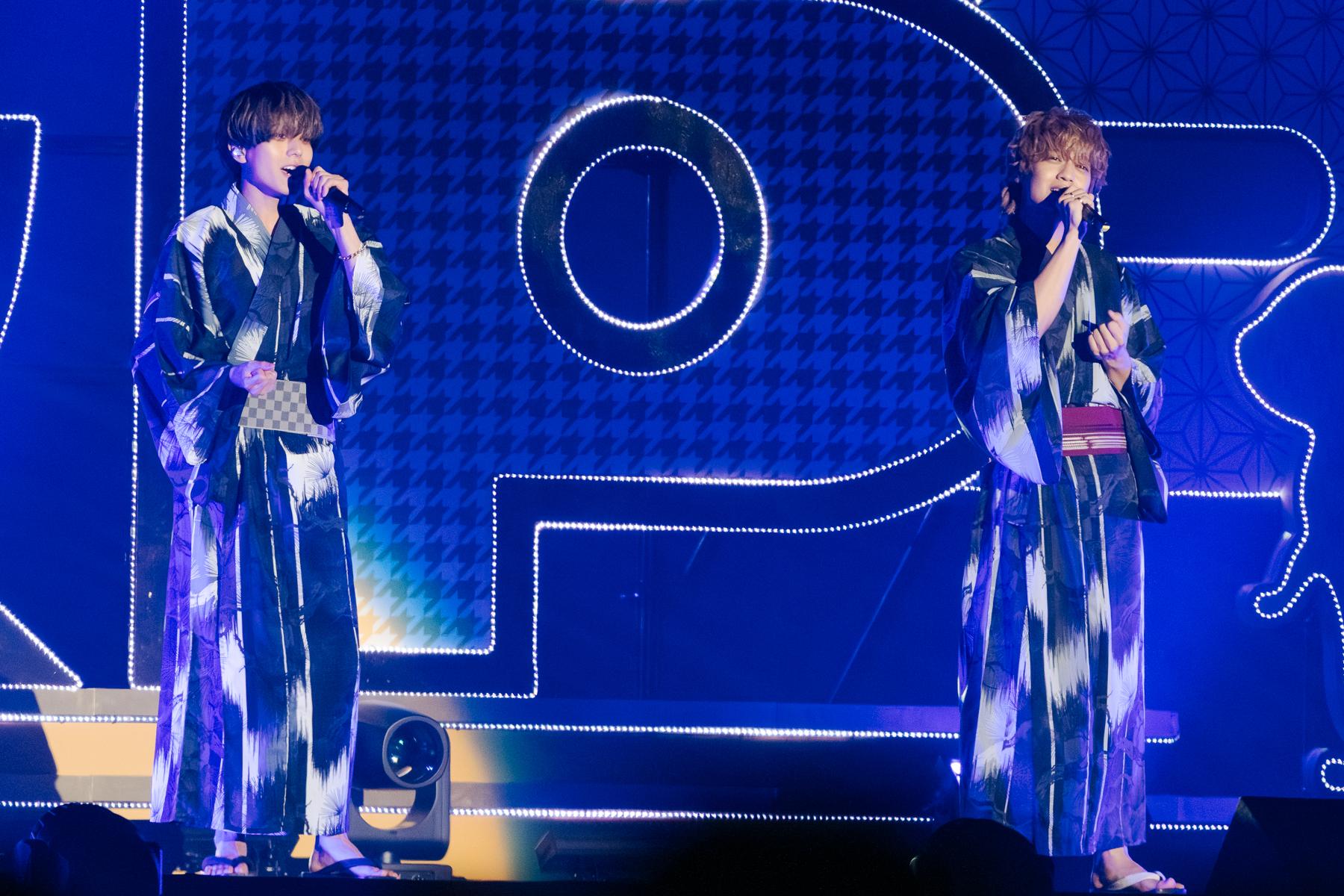ここでしか聴けない特別な二人のハーモニーに沸く会場。歌ってから、前⽇に歌ったという桑⽥佳祐さんの「⽩い恋人達」をアカペラで二人でワンフレーズ披露。「昨⽇は桑⽥さんの『⽩い恋人達』を歌って。普段、⾃分たちのライブだとなかなかできないから」と特別な試みをチャレンジできたことに喜ぶ。