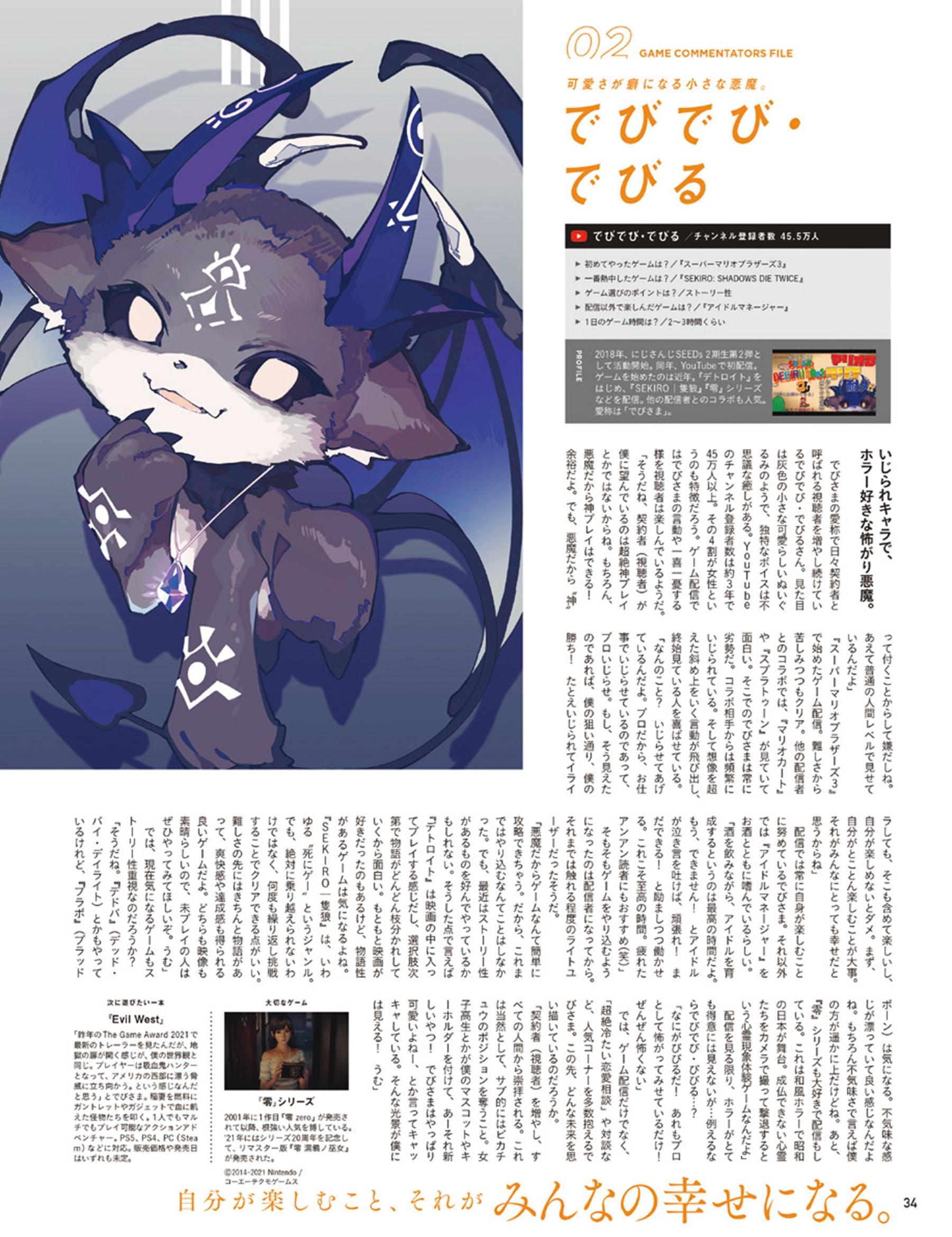 No.2285(2022年2月2日発売)/初めてananに登場した「にじさんじ」ライバーは、力を強くするため活動を始めた異世界の悪魔、でびでび・でびるさん(愛称は「でびさま」)。この号は創刊以来初の「ゲーム」特集、初×初のコラボとなった。ゲーム遍歴を語るインタビューもでびさま節全開!
