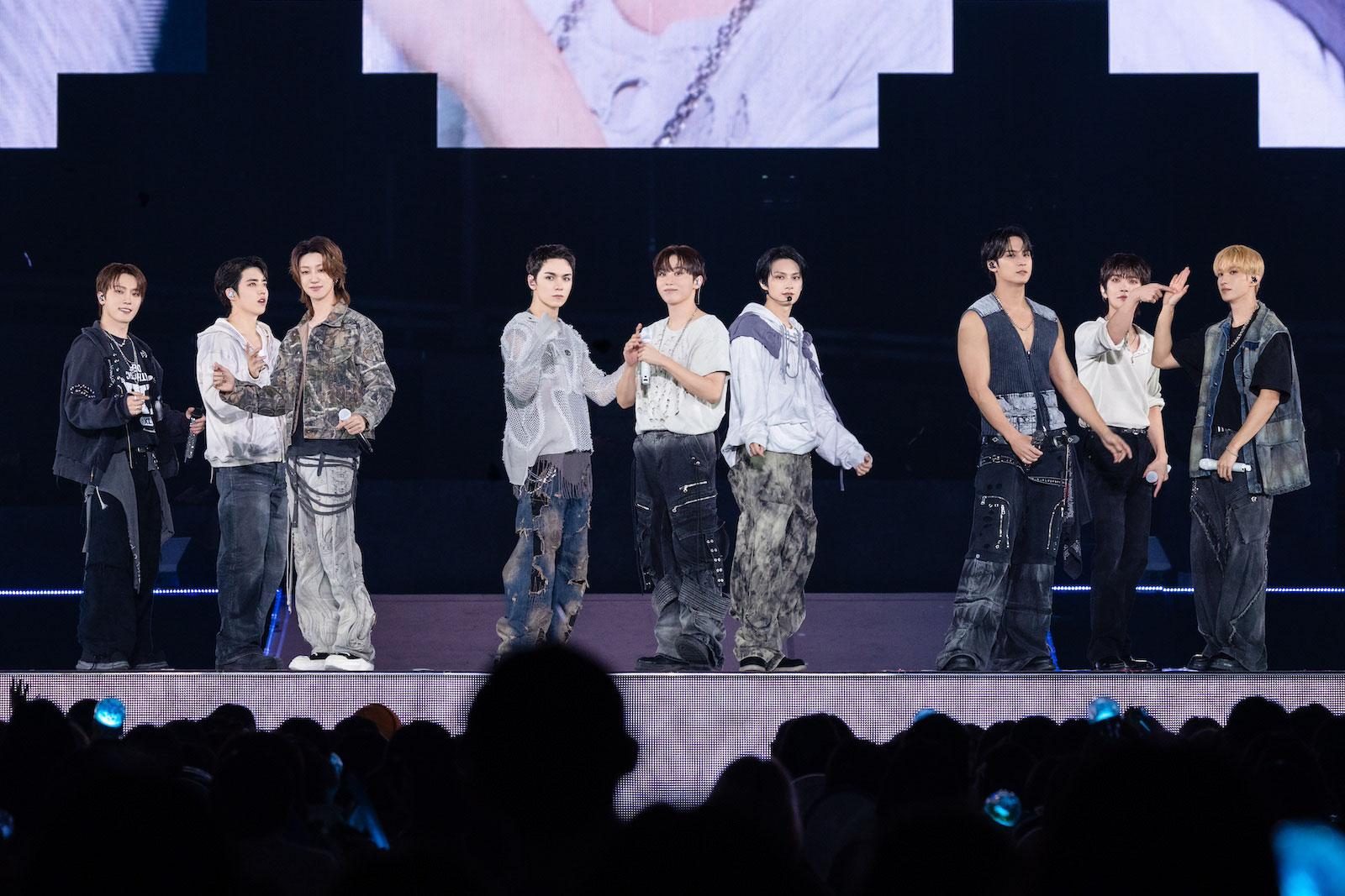 続く「God of Music」でも会場では⼤合唱が響き渡り、「CALL CALL CALL!」ではメンバーが輪になって即興でダンス。左回りで踊っていたかと思えば右回りに反転したり、ステージを元気いっぱいに踊りながらはしゃぎ倒し、ドームも⼤盛り上がり。全⼒を出し尽くし、ステージに倒れるSEUNGKWANを起こすために、続けざまにBBSの「Fighting」がかかると、メンバーもCARATも再び気⼒を取り戻し、その勢いのままに「Super」でドームの盛り上がりは最⾼潮に。