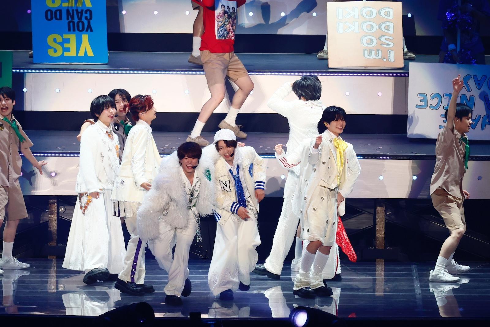 「なにふぁむ! 京セラ! ラストスパート、⾏くぞー!」と藤原さんが煽り、⻘春感が詰まった「Blue Story」、ジュニア時代に何度も歌っていた「僕空〜⾜跡のない未来〜」へ。「夢が叶ったぞー!」「ありがとー!」と喜びいっぱいに⼤声をあげる⼤橋さんの声で、京セラ中に多幸感が広がっていく。