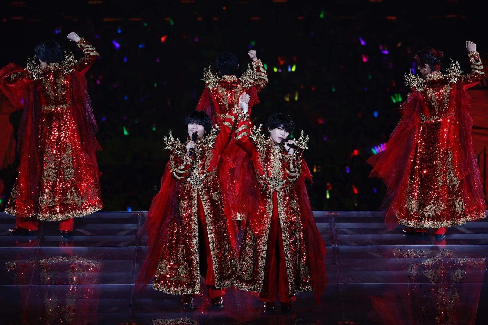ライブの⾐装を担当する⻑尾謙杜さんは「ドームツアーのオープニングは、『絶対に⾚で出よう』ってアリーナツアーの⾐装を作っている時から決めていました。⼀番こだわったのは王冠です。7⼈で王冠をかぶって出てくるってことは、相当な勇気が必要だと思いますし、覚悟がいることだと思うので、そこは⾒てもらえたら嬉しいなと思います」と会⾒で話していたように、デビュー5年⽬の貫禄を感じる堂々とした登場で観客を圧倒した。