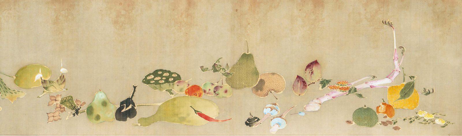 一方、《菜蟲譜(さいちゅうふ)》は、《果蔬図巻》の1年後に描かれた長さ11mに及ぶ大作で、前半部分に野菜や果物、後半部分に昆虫、蝶、爬虫類などの数々の生き物が描かれており、国の重要文化財に指定されている。