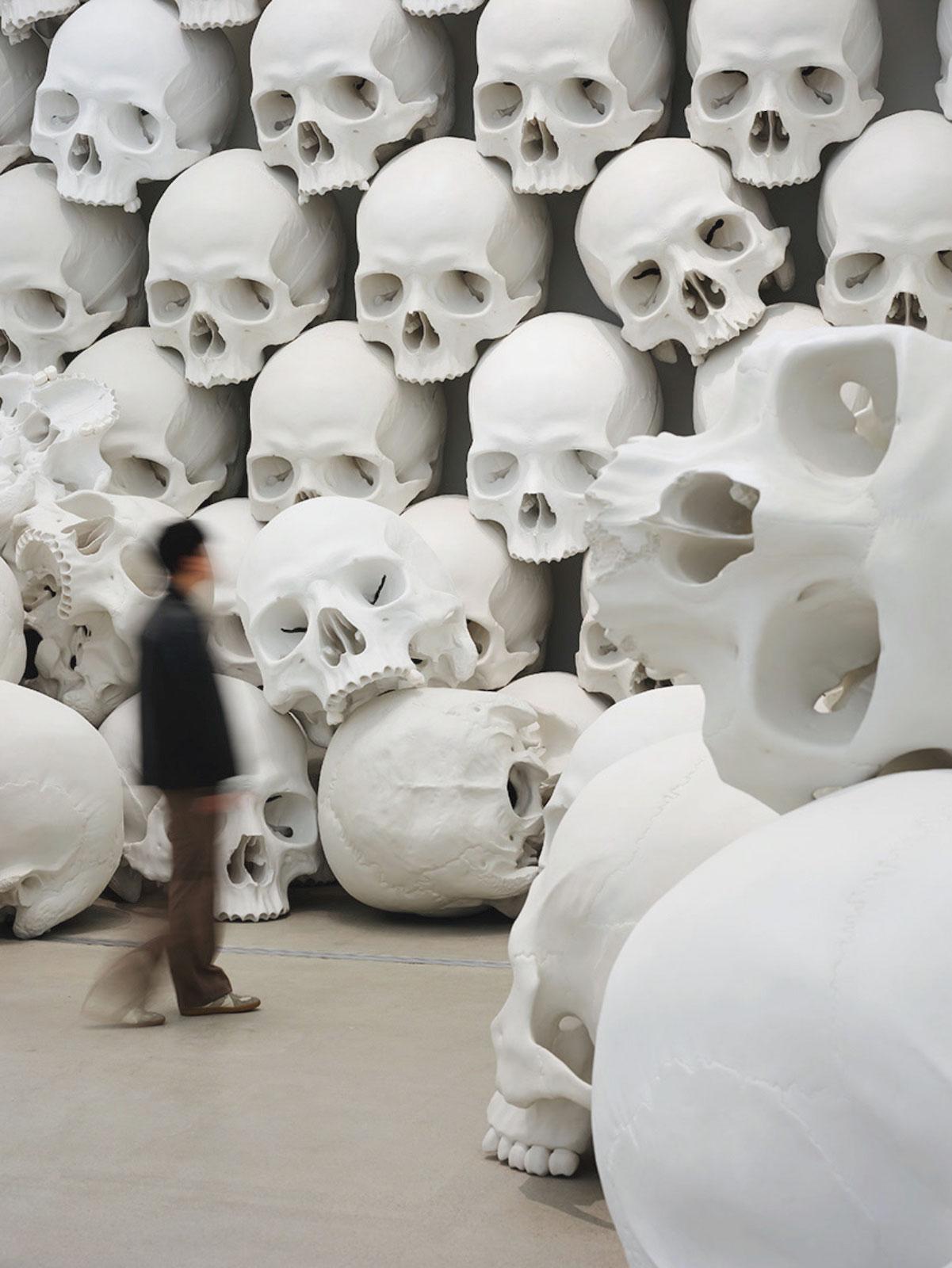 今回の目玉となるのは、巨大な頭骸骨の彫刻100点で構成されるインスタレーション《マス》だ。この作品は毎回、美術館の展示空間に合わせて再構築され、森美術館でも約300㎡にも及ぶ圧巻の仕上がりとなっている。また、フランスの写真家・映画監督のゴーティエ・ドゥブロンドによる、作家のスタジオと制作過程を記録した写真と映像作品もあわせて展示され、ミュエクの作品がどのように生み出されるのか、その過程にも光を当てる。