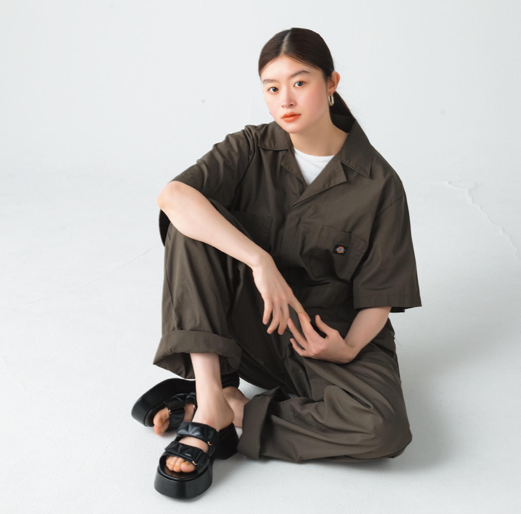 オールインワン¥9,900(ディッキーズ TEL. 0120-008-503) Tシャツ2枚セットで¥3,520(ヘインズ/ヘインズブランズ ジャパン カスタマーセンター TEL. 0120-456-042) サンダル¥33,000(エルエムエス/ジャック・オブ・オール・トレーズ プレスルーム)