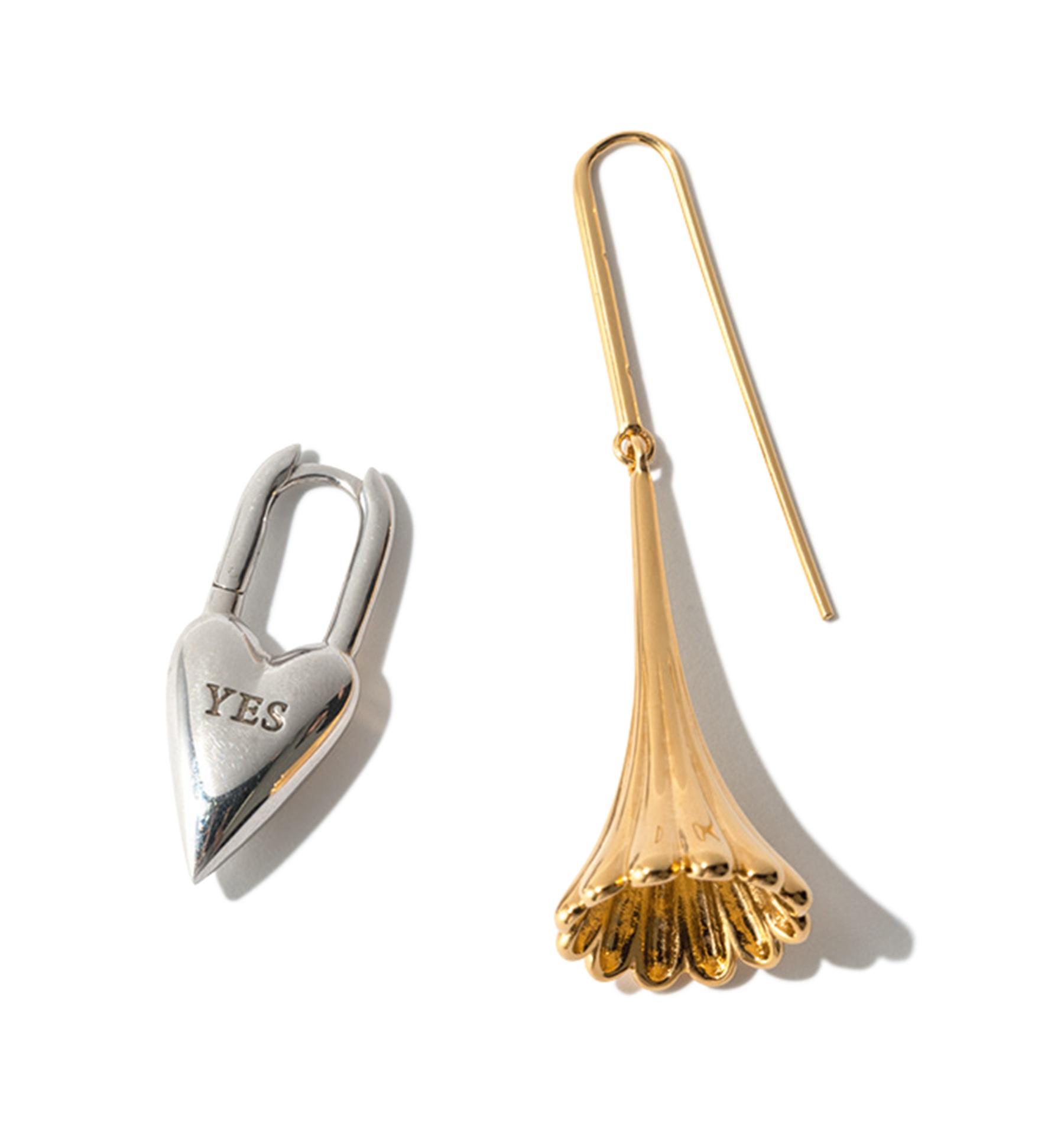 ハートの錠前に、放射状に伸びるユニークな形。耳元にエッジーなムードを呼び込むシングルピアスは、ベルリン発のブランドから。