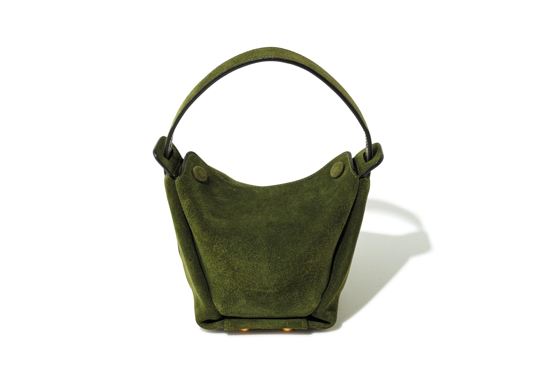 コンパクトなスエードバッグは、ショルダーストラップ付きの2WAY仕様。秋の訪れを感じさせる、深みのあるグリーンにうっとり。